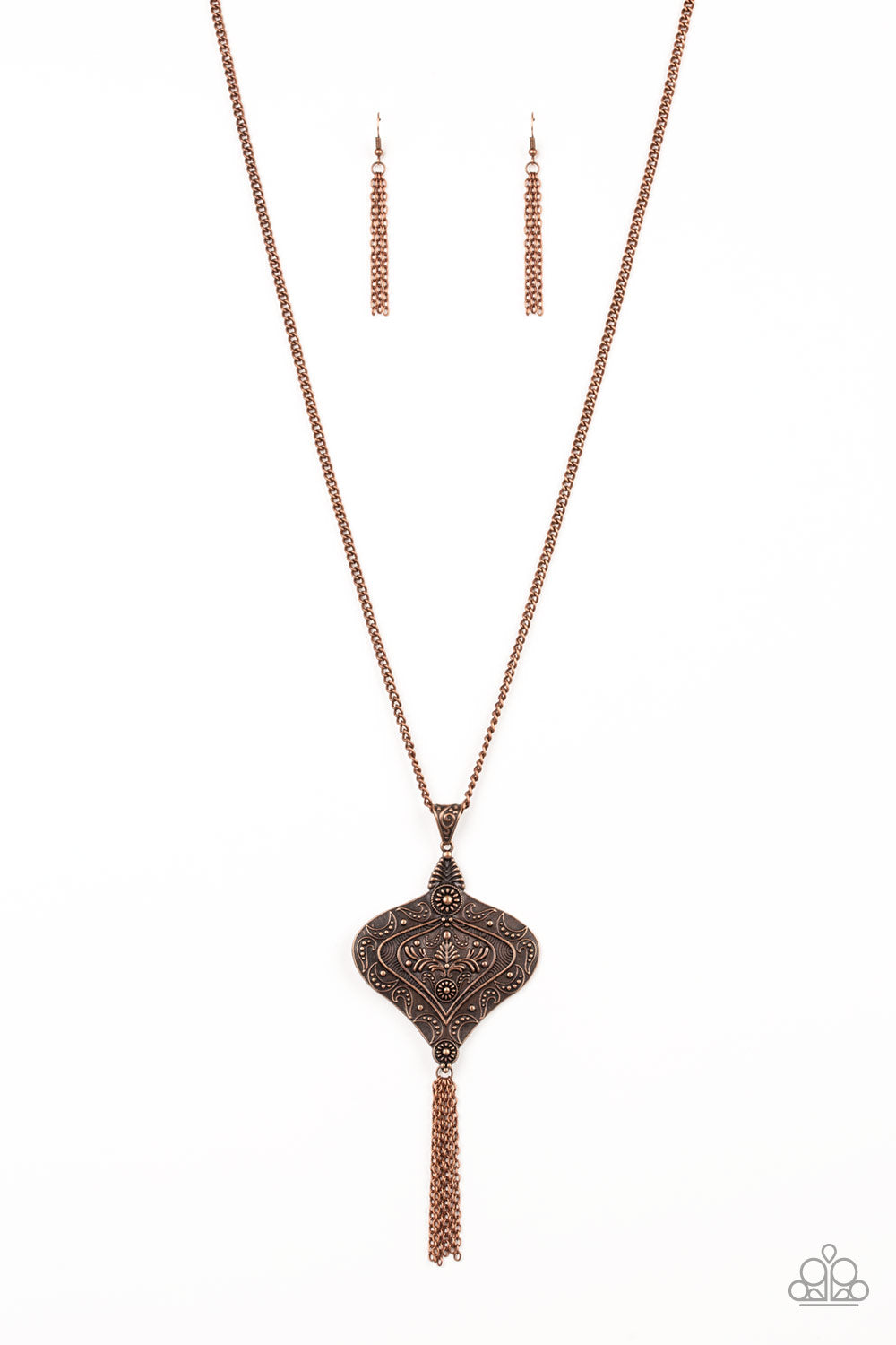 Embossed and studded in ornate details, an oversized copper pendant swings from the bottom of a lengthened copper chain for a rustic look. Antiqued copper chains stream from the bottom of a decorative frame, adding dramatic length to the seasonal piece. Features an adjustable clasp closure.