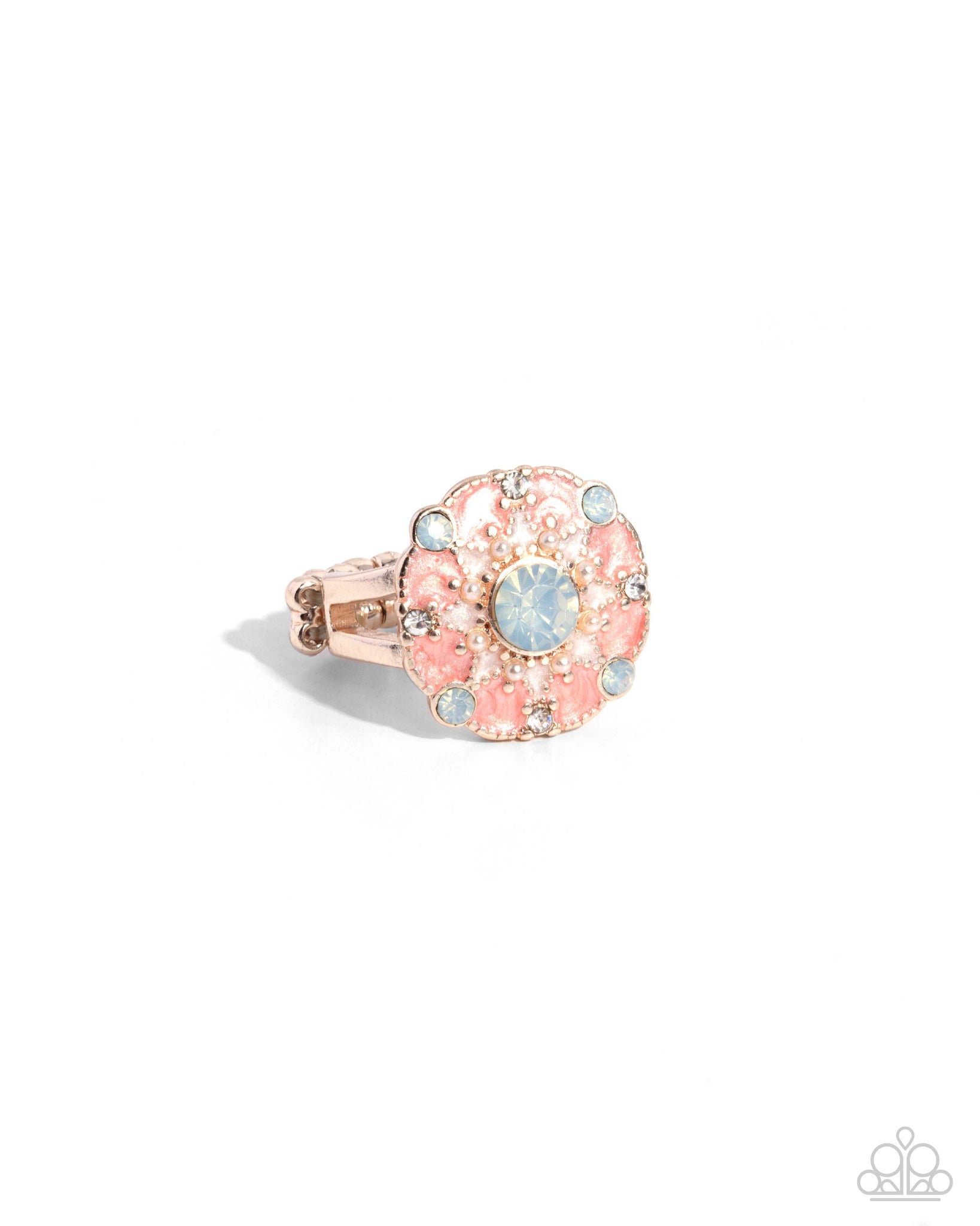 Featuring a stellar kaleidoscopic effect, a collection of crystal-like opalescent gems, white pearls, rose gold studs, and white rhinestones coalesce around an oversized opalescent gem atop a light pink pearl-painted warped rose gold disc atop airy rose gold bands for an eye-catching centerpiece. Features a dainty stretchy band for a flexible fit.