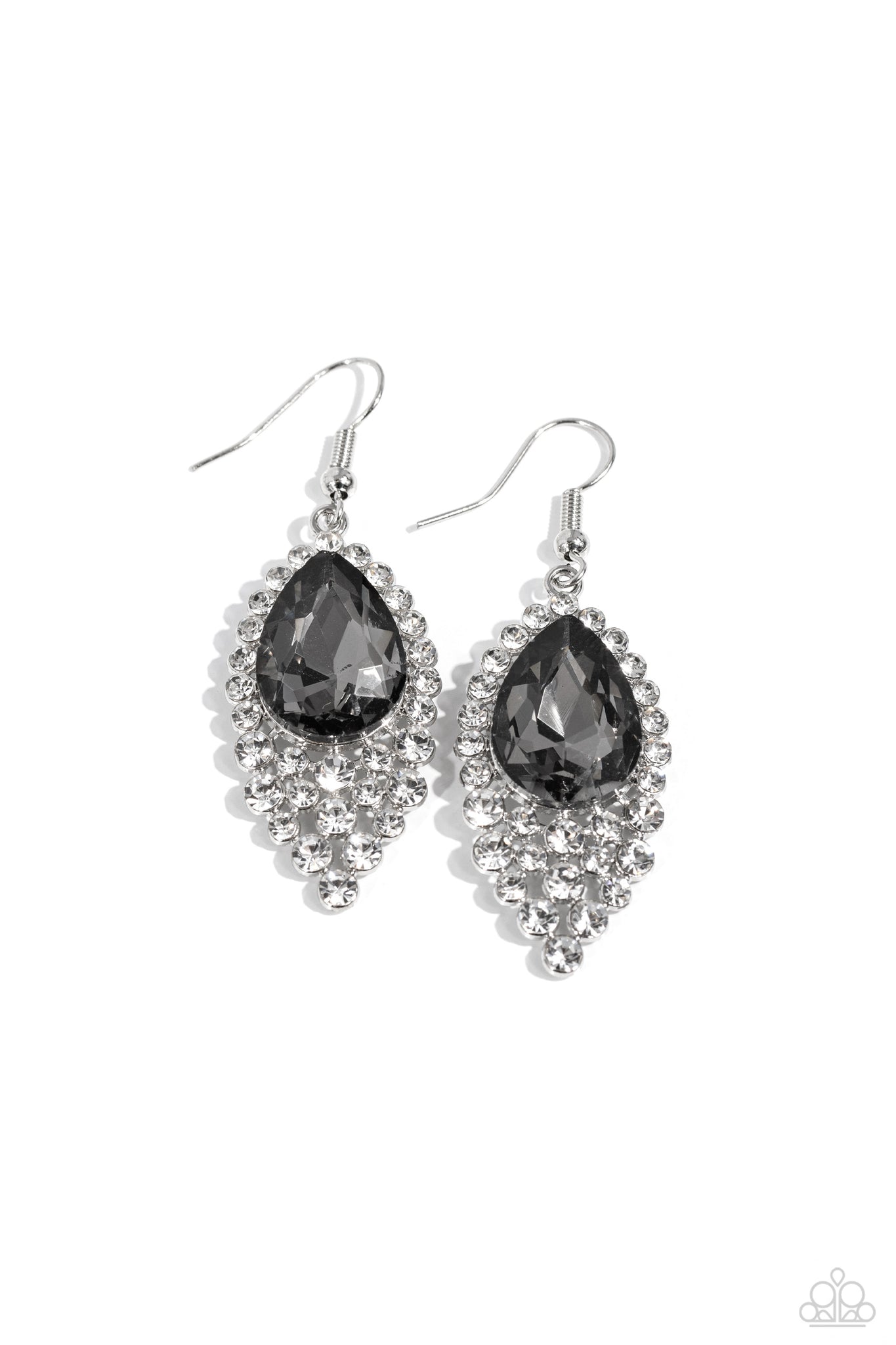 An oversized smoky teardrop gem is pressed into a glittering backdrop of glassy white rhinestones, cascading into an elegant effervescence. Earring attaches to a standard fishhook fitting.