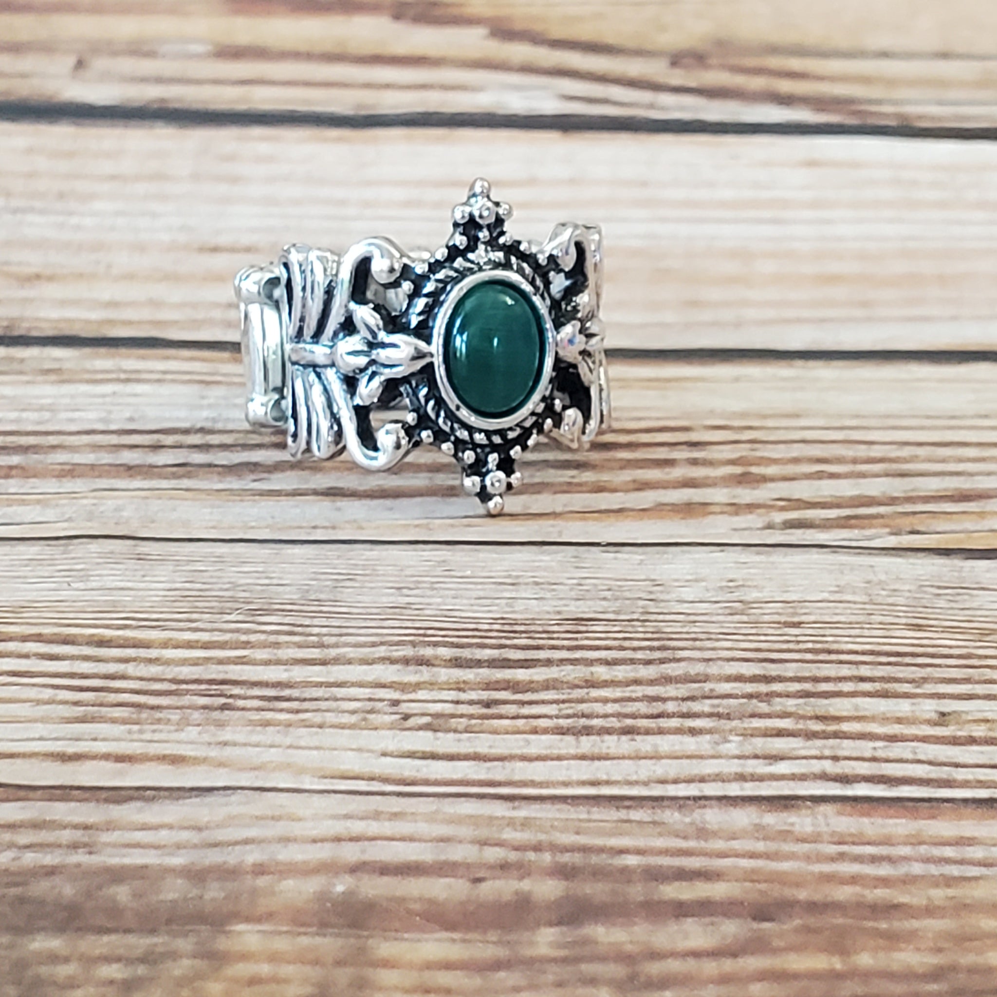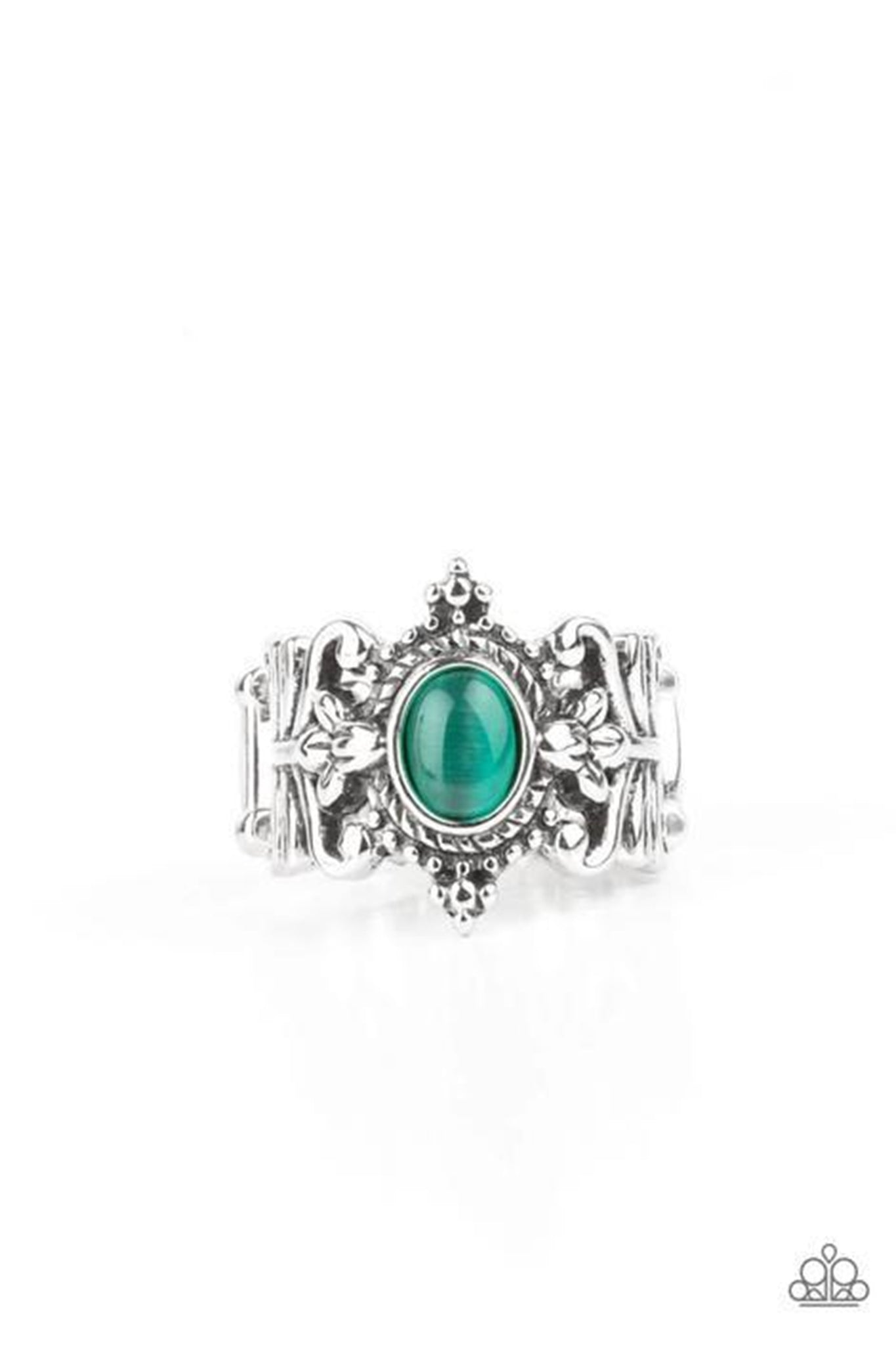 A glassy Mint cat's eye stone is pressed into the center of a studded and metallic rope-like frame. Leafy floral bands delicately overlap the whimsical frame, coalescing into a tropical inspired centerpiece. Features a stretchy band for a flexible fit.