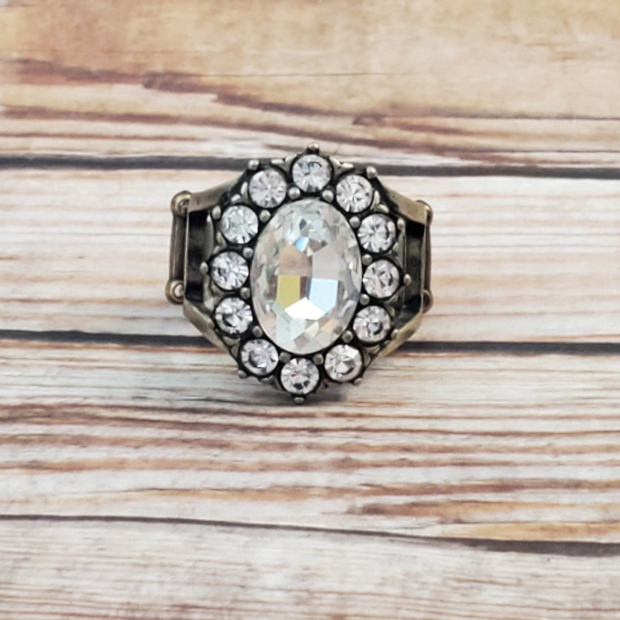 A dauntless oval rhinestone is encircled by dainty sparkling gems. Accented with petite antiqued brass studs, the dramatic design joins with an airy layered brass band to create a captivating arrangement atop the finger. Features a stretchy band for a flexible fit.