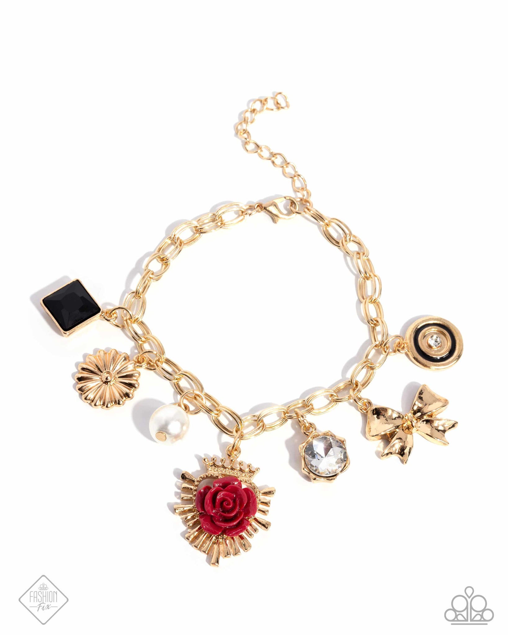 Glistening gold cable chain links, lead around the wrist featuring a collection of haughty charms, including a textured gold flower, a wine acrylic rosette blooming atop a royal crown-inspired coat of arms sporadically dotted with white rhinestones, a square-cut black gem, a gold bow, a black-painted layered gold pendant with a white gem center, a white gem pressed in a spiky floral gold frame, and a polished, solitaire white pearl. Features an adjustable clasp closure.