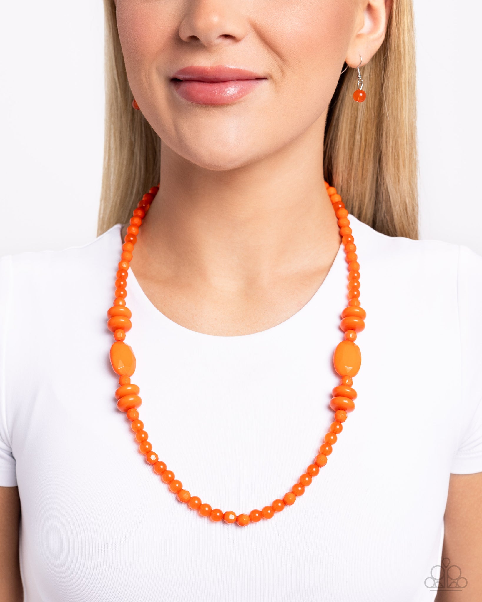 Varying in size, shape, and opacity, a vivacious orange collection of cloudy and solid acrylic beads drapes across the chest for a playful pop of color. Features an adjustable clasp closure.