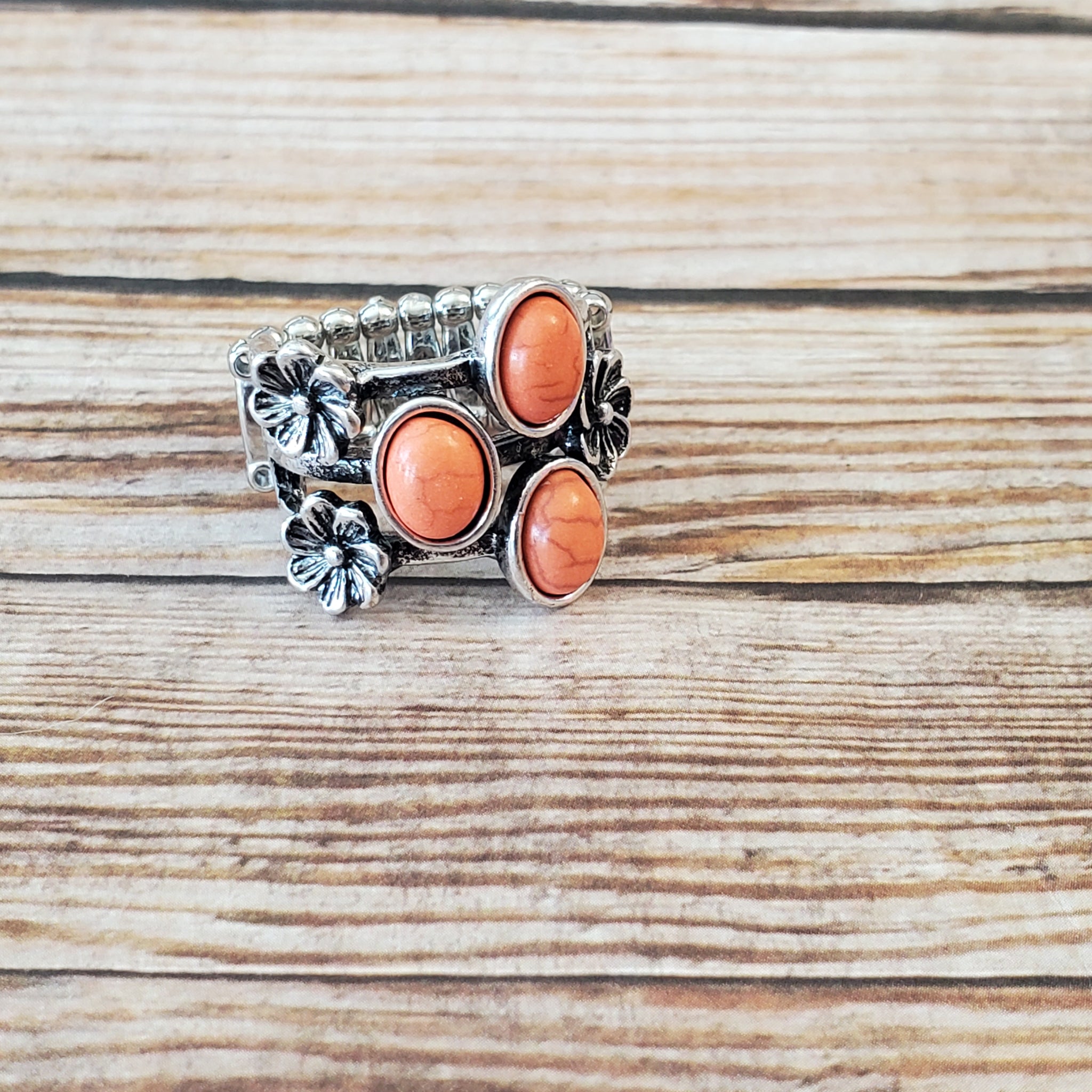 Dotted with antiqued silver floral frames and vivacious orange stone accents, three silver bands arc across the finger for a whimsically layered look. Features a stretchy band for a flexible fit.