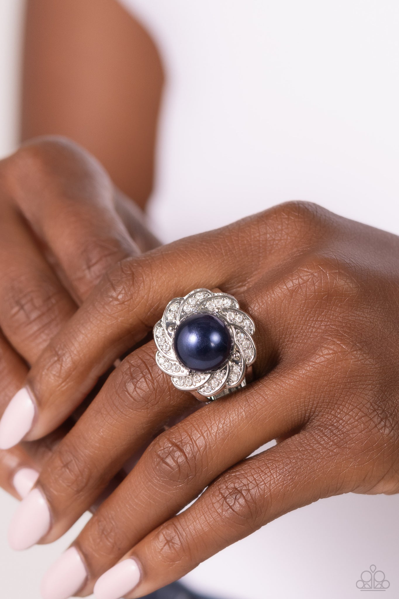 A whirl of white rhinestone encrusted silver petals blooms from a dramatically oversized blue pearl drop center, culminating in an elegant floral centerpiece atop the finger. Features a stretchy band for a flexible fit.