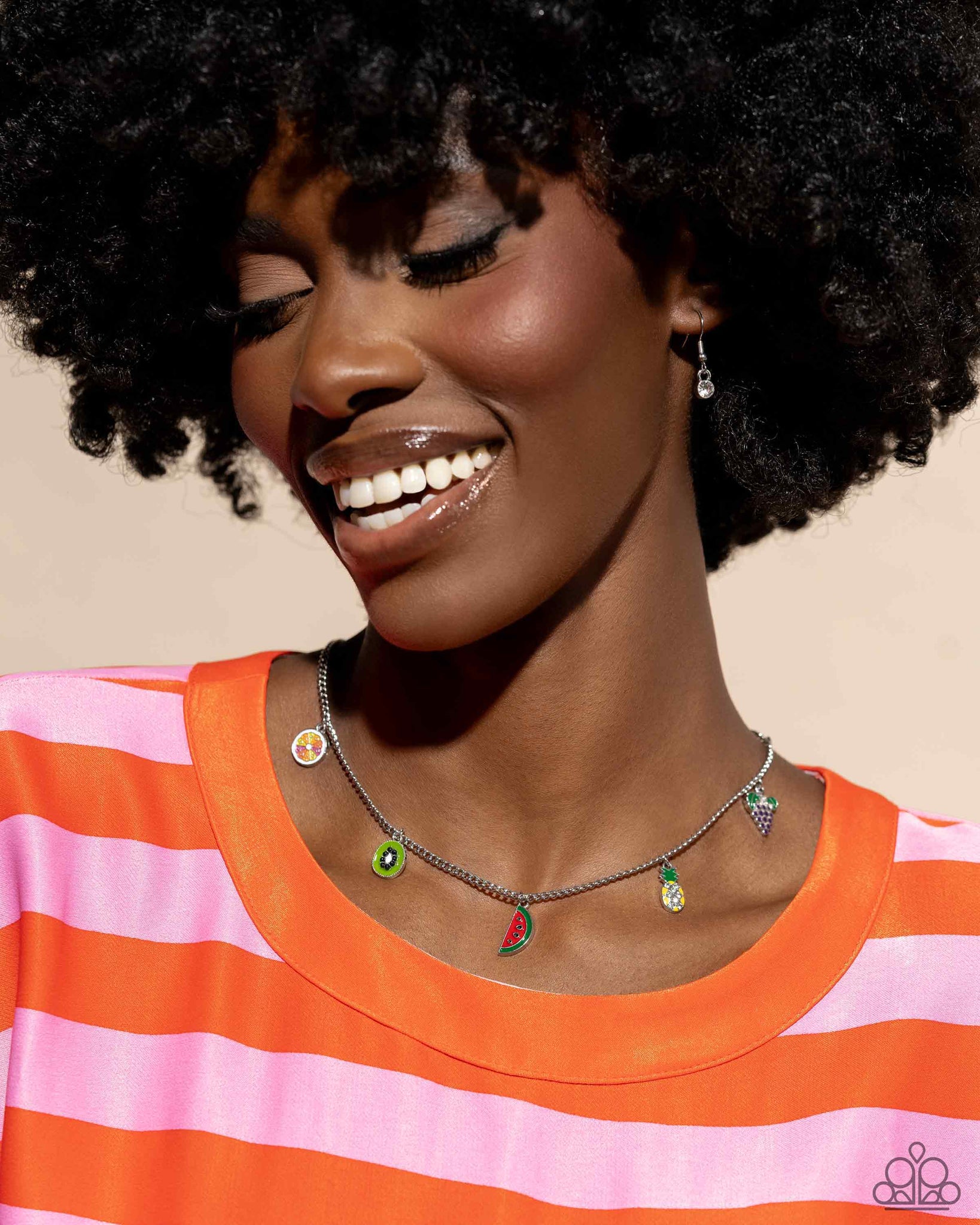 Gliding along a classic silver chain, a collection of fruit charms gathers for a summer-inspired design, including purple grapes, a white rhinestone-dotted yellow pineapple, a red watermelon slice, a kiwi slice with tactile black seed beads, and a multicolored citrus slice. Features an adjustable clasp closure.
