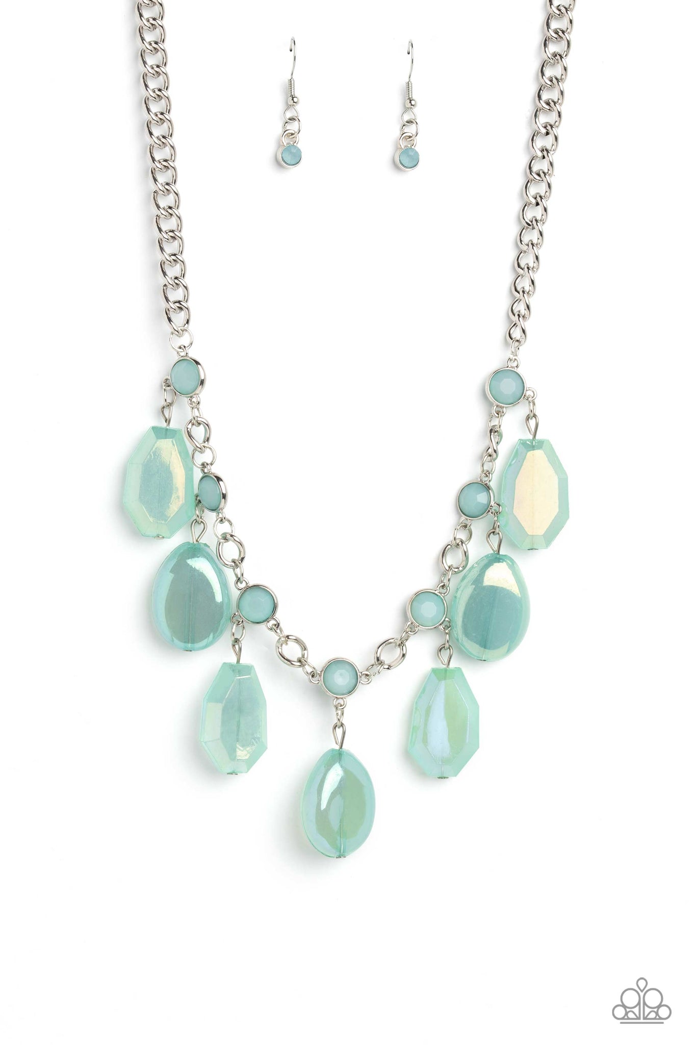 A collection of chiseled, clear and milky geometric shapes in Waterspout hues feature an iridescent overlay as they cascade from a silver curb chain, resulting in a bubbly and boisterous fringe below the collar. A layer of faceted milky Waterspout beads are infused along the silver chain for an additional pop of color. Features an adjustable clasp closure.