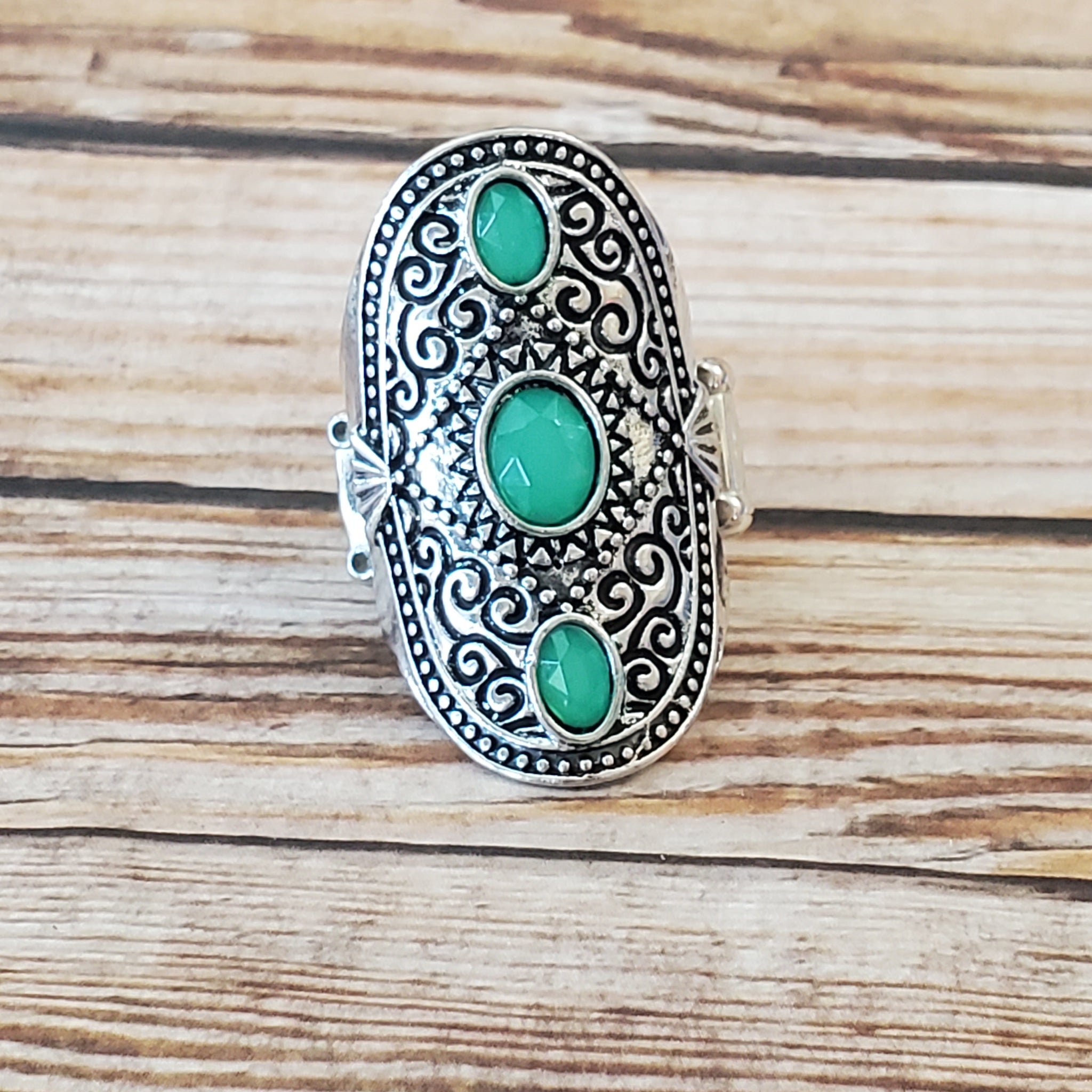 A trio of opaque Mint oval beads encased in silver frames graces the top of an elaborately decorated silver band. Dotted texture and floral designs create a statement-making finish atop the finger. Features a stretchy band for a flexible fit.