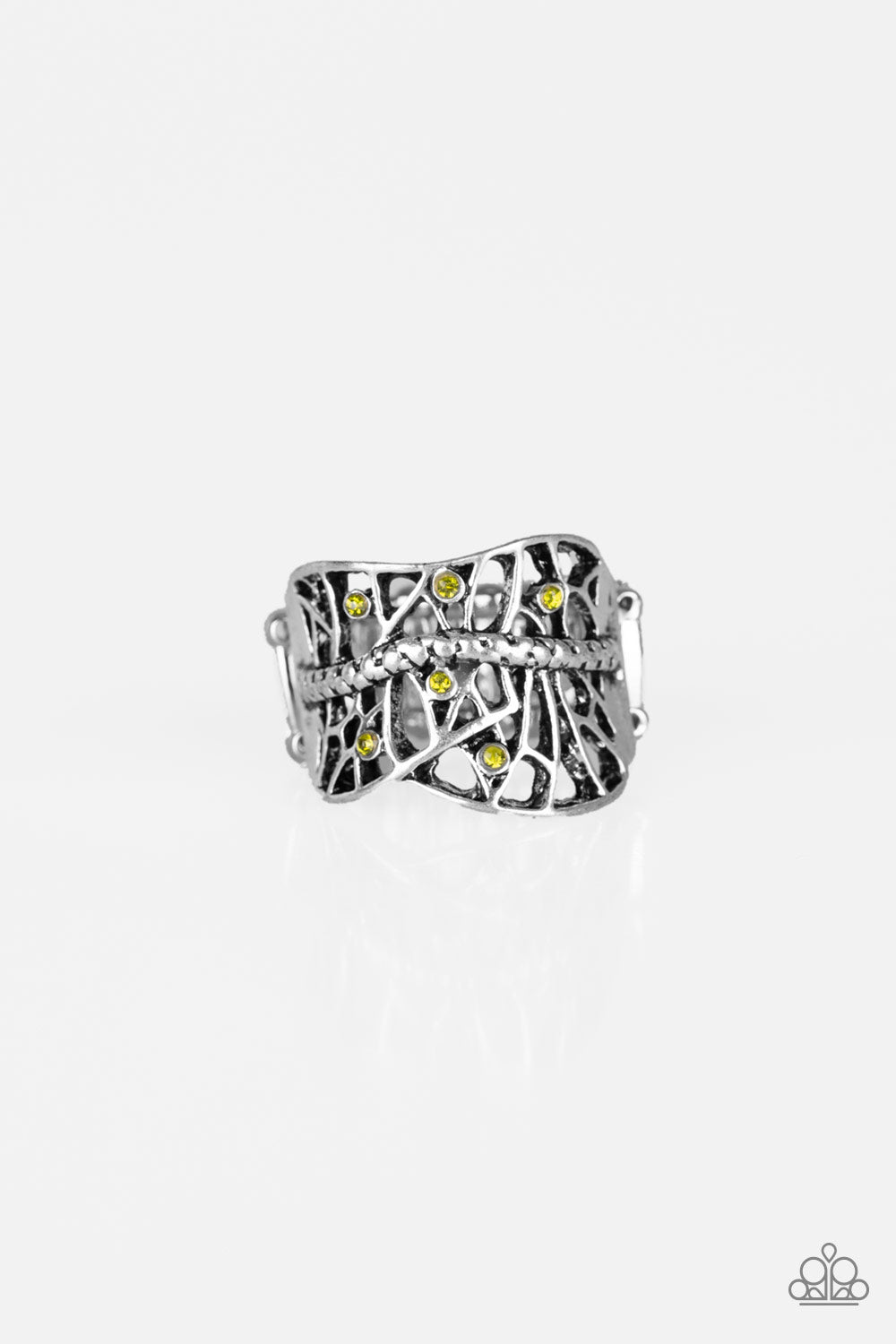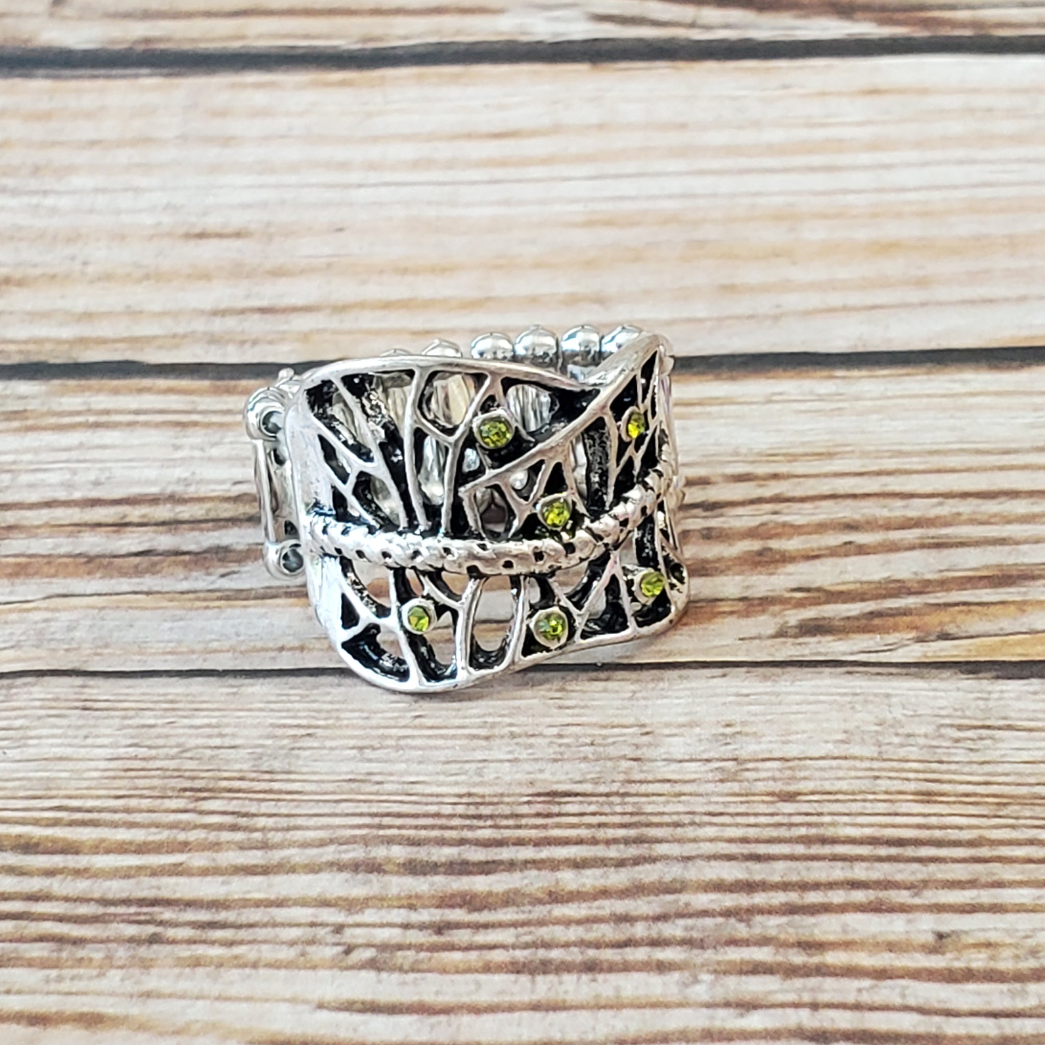 Dainty green rhinestones are sprinkled along a shattered silver frame, creating an edgy centerpiece atop the finger. Features a stretchy band for a flexible fit.