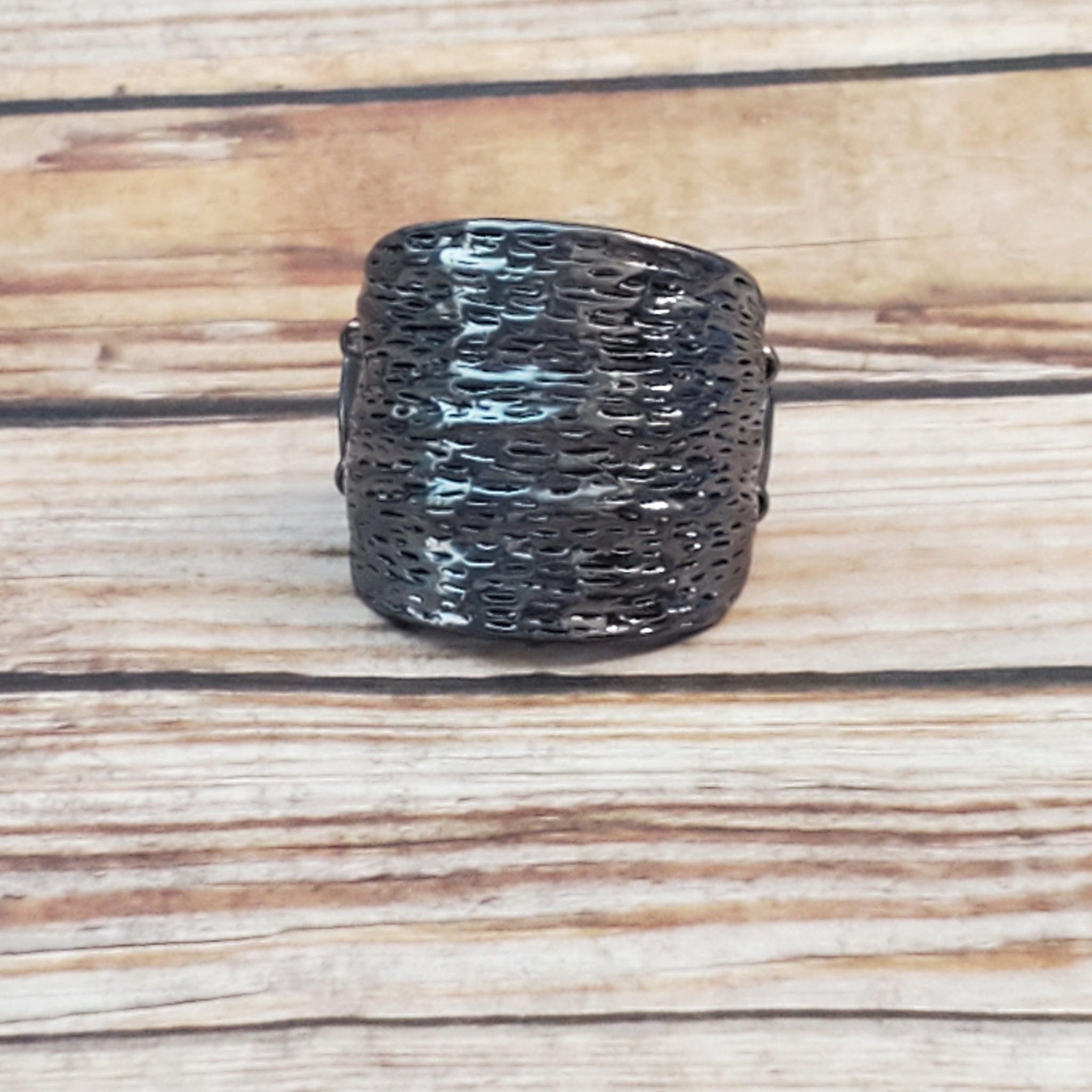 Radiating with patterns derived from nature, a rippling gunmetal frame curves around the finger for a bold look. Features a stretchy band for a flexible fit.