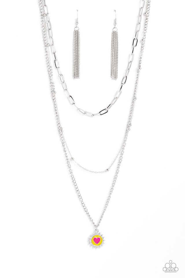 Three silver chains cascade in various lengths across the chest, creating a radiantly edgy display. The centermost chain is dotted with silver studs while a sunburst silver frame, embellished with an Empire Yellow center and a pink painted heart, creates a youthful pendant at the bottom of the longest chain in a colorful finish. Features an adjustable clasp closure.