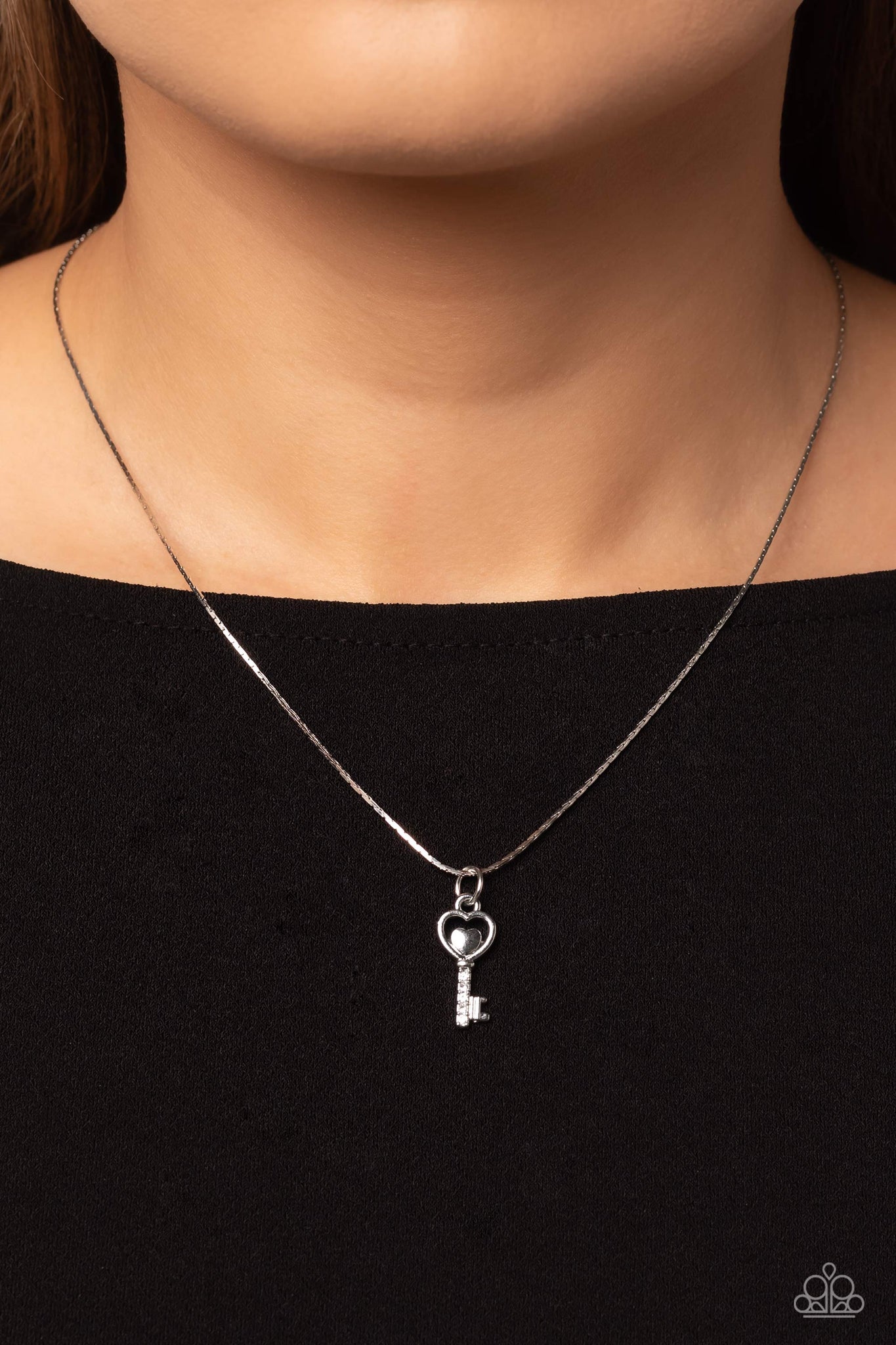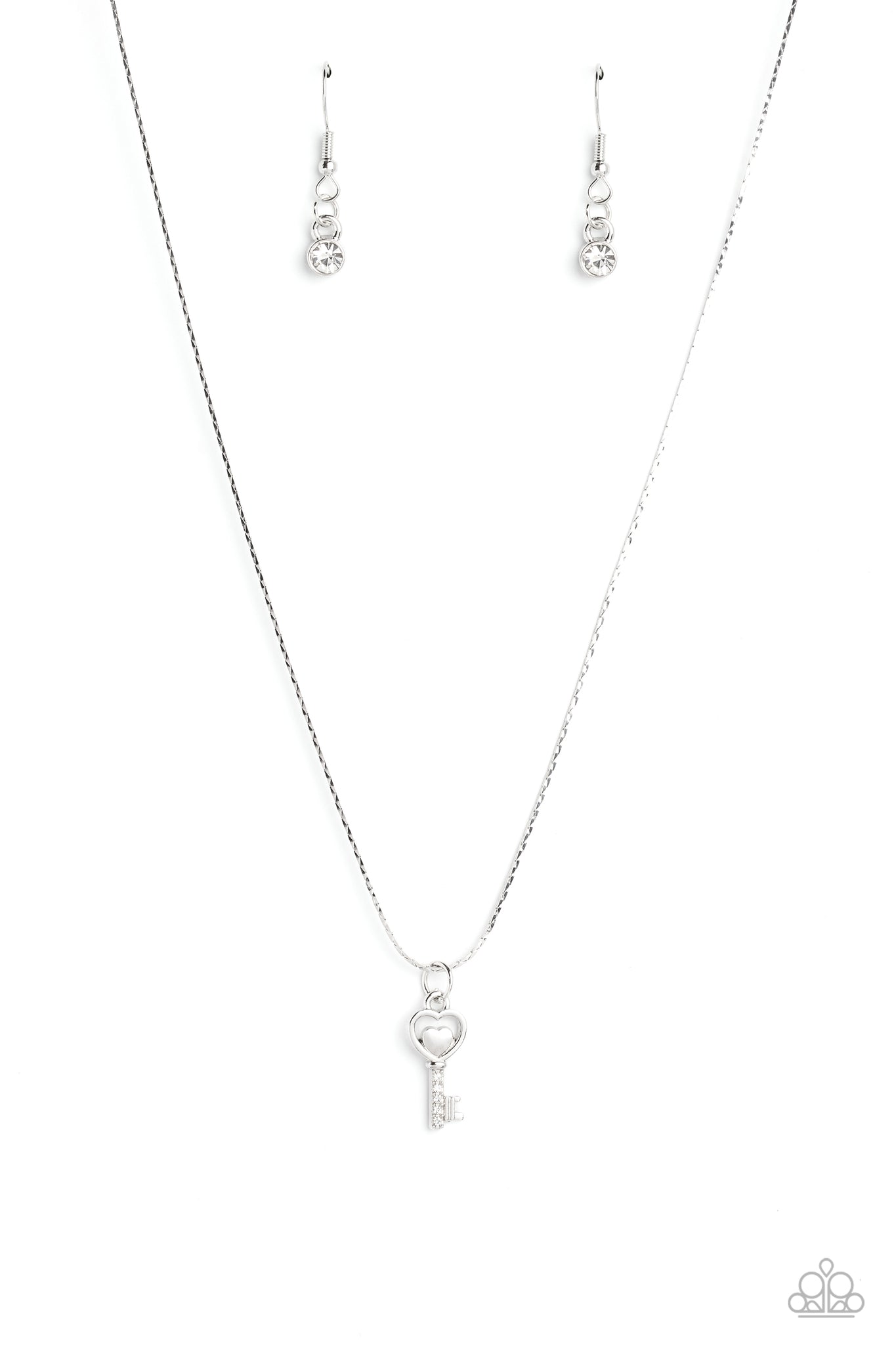 Dotted with glittery white rhinestones, a key pendant with a heart outline swings from the bottom of a dainty silver chain for a whimsical look. Features an adjustable clasp closure.