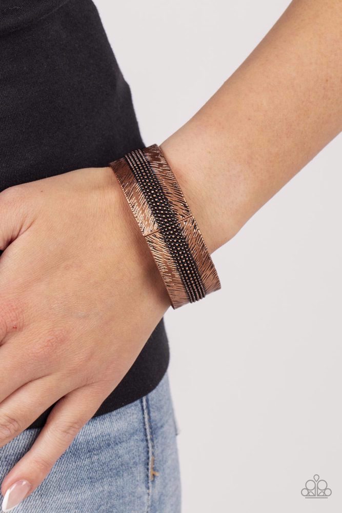 A thick band of copper is etched in feathery texture, creating a tactile statement piece that boldly wraps around the wrist. Rows of antiqued copper studs travel around the center of the thick copper band, adding eye-catching dimension and grit to the design. Features a hinged closure.