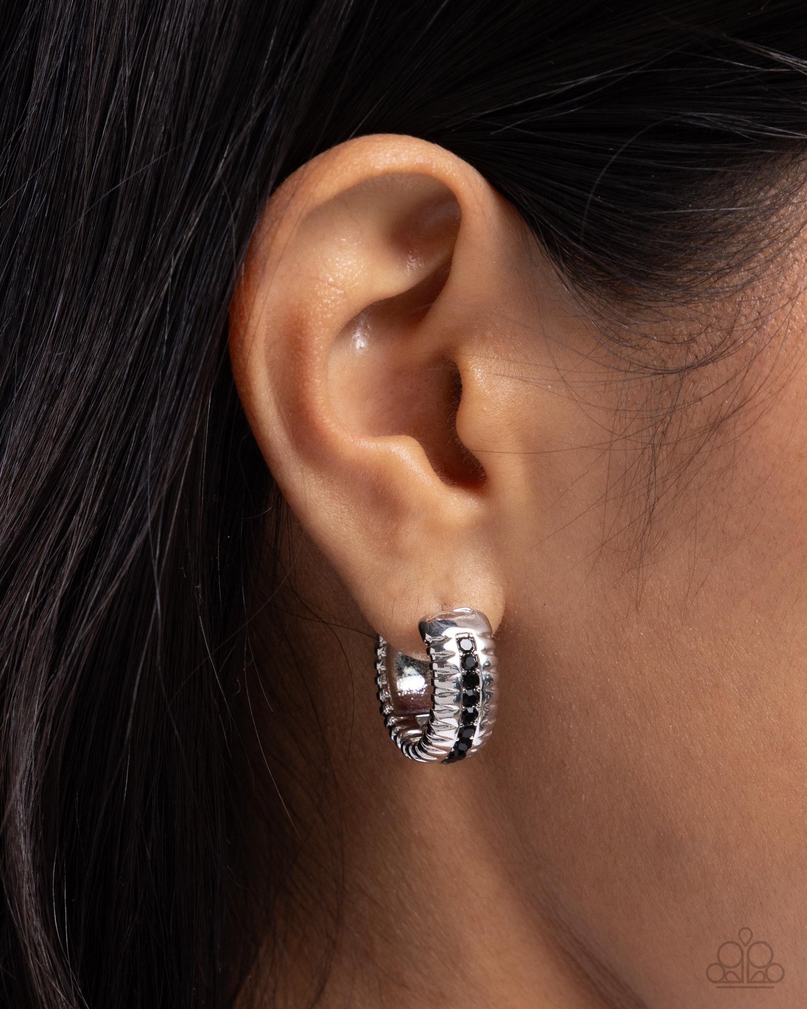 Set along the center of a ribbed silver hoop, a row of jet-black rhinestones glistens and hugs along the ear for a pop of edgy color. Earring attaches to a standard post fitting. Hoop measures approximately 3/4" in diameter.