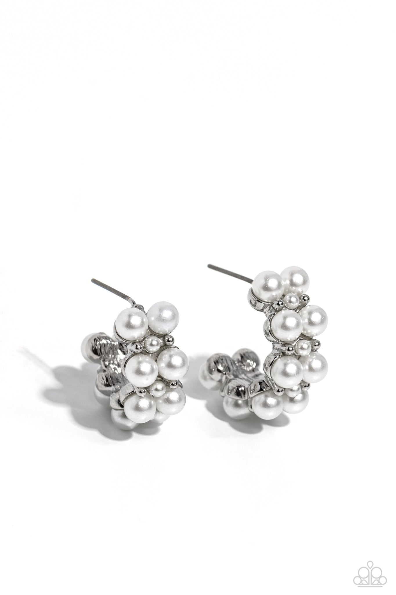 Two rows of bubbly white pearls stack and form into a scalloped pattern. Daintily curling around the ear, the bubbly effect of the high-sheen silver studs and daintier pearls separating the larger pearls creates a radiant, refined hoop. Earring attaches to a standard post fitting. Hoop measures approximately 1" in diameter.