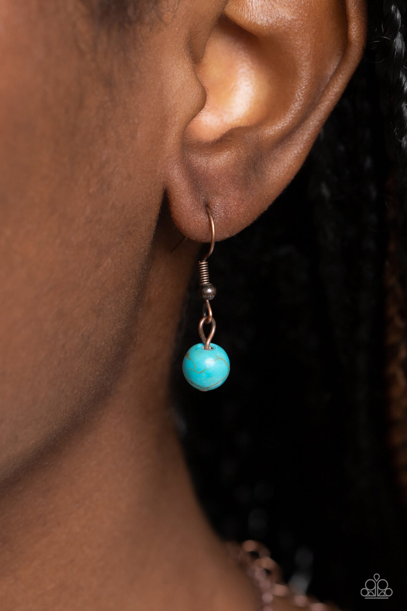An oval turquoise stone is pressed into the center of an asymmetrical copper frame radiating with mismatched copper textures, resulting in an artisan inspired pendant at the bottom of an extended copper chain. A lobster clasp hangs from the bottom of the design to allow a name badge or other item to be attached. Features an adjustable clasp closure.