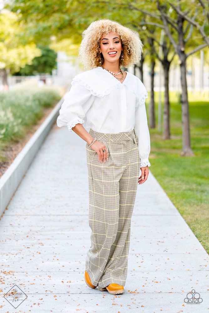 A glassy, faceted, teardrop-shaped bead in a subtle peach undertone swings from the top of a brass, diamond-shaped frame. A cascade of brass chains falls from the bottom point of the frame, accompanied by a cluster of opaque beading in a soft peach tone and another smaller glass bead that matches the one swinging above. Earring attaches to a standard fishhook fitting.
