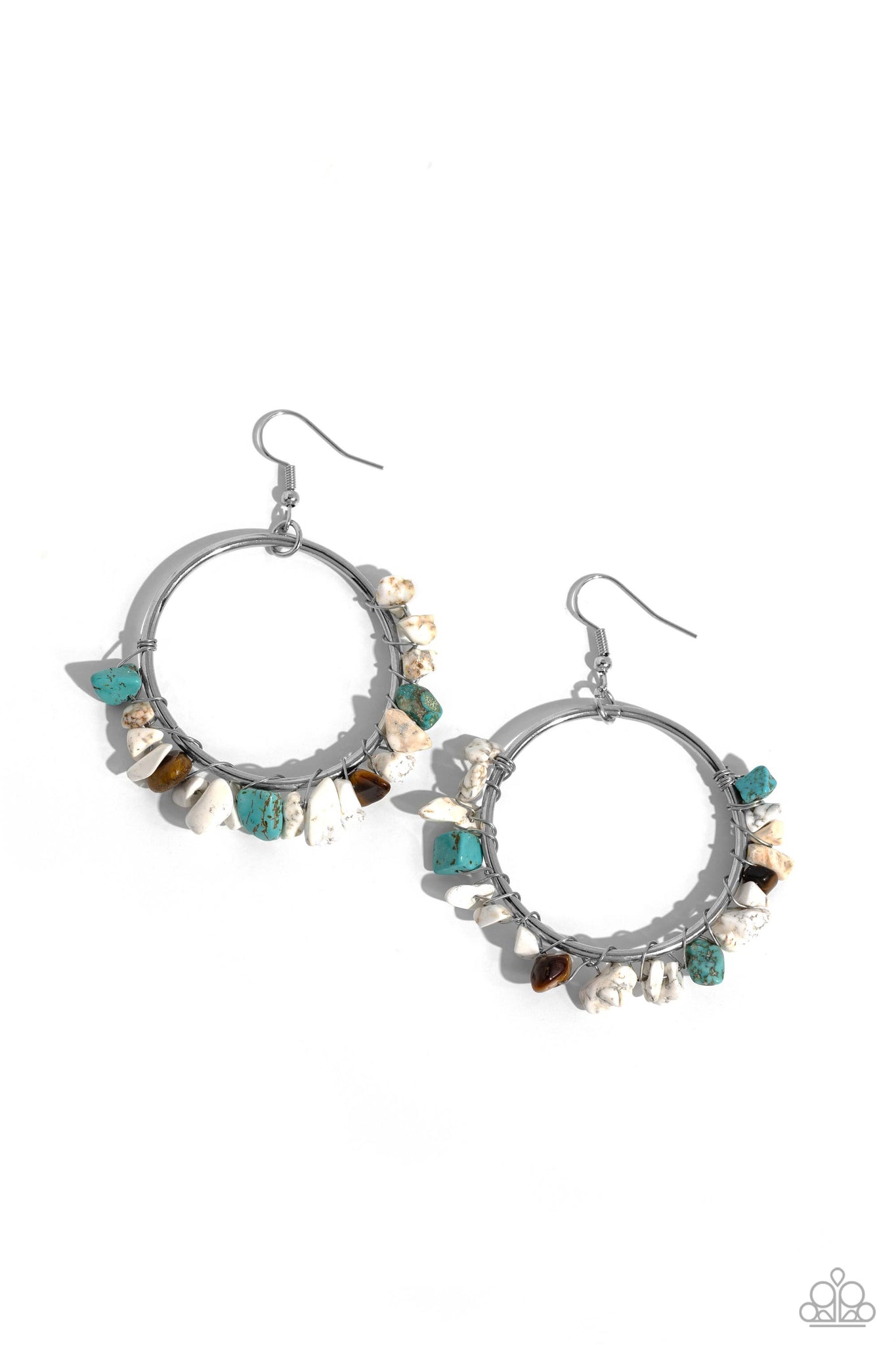 A colorful collection of chiseled white, turquoise, and tiger's eye stones are wrapped along the bottom of a shiny, silver hoop by shimmery silver wire for a handcrafted, earthy finish. Earring attaches to a standard fishhook fitting. As the stone elements in this piece are natural, some color variation is normal.