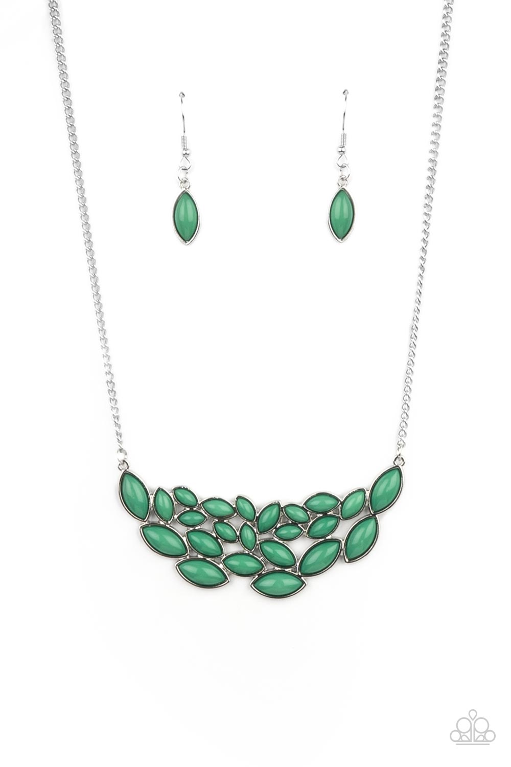 Encased in sleek silver frames, a collection of marquise shaped Mint beads delicately coalesce into a leafy pendant below the collar for a whimsical pop of color. Features an adjustable clasp closure.