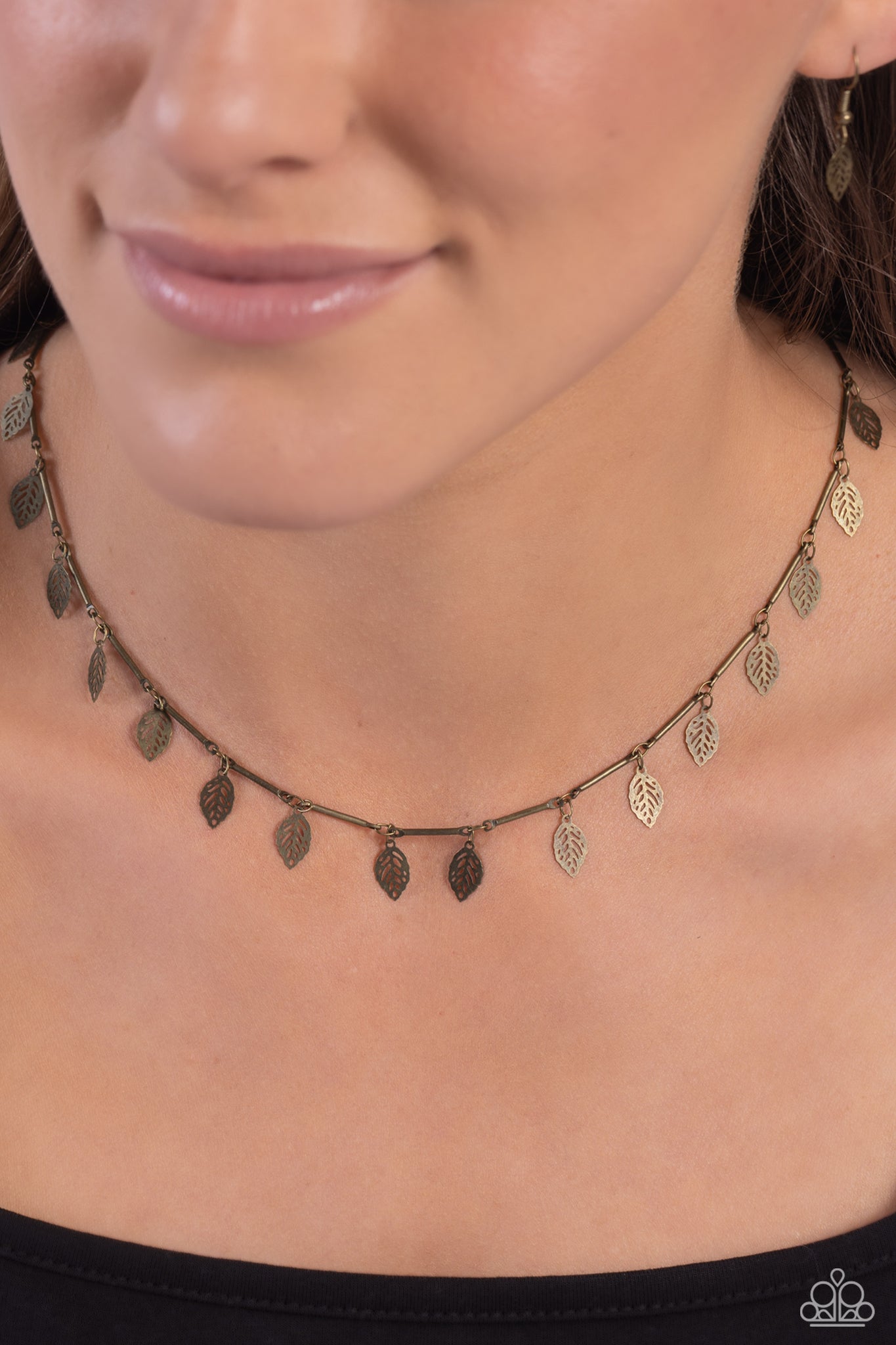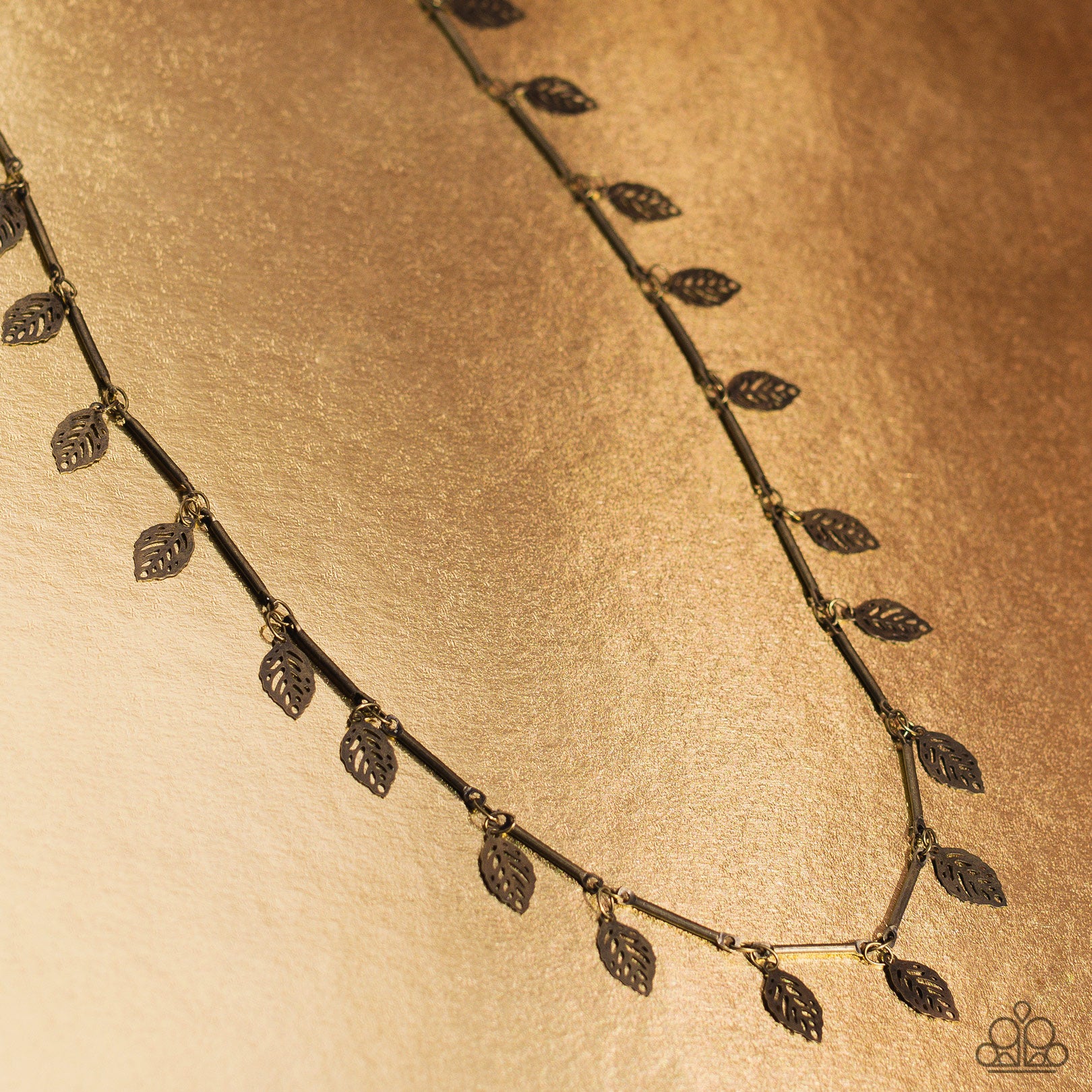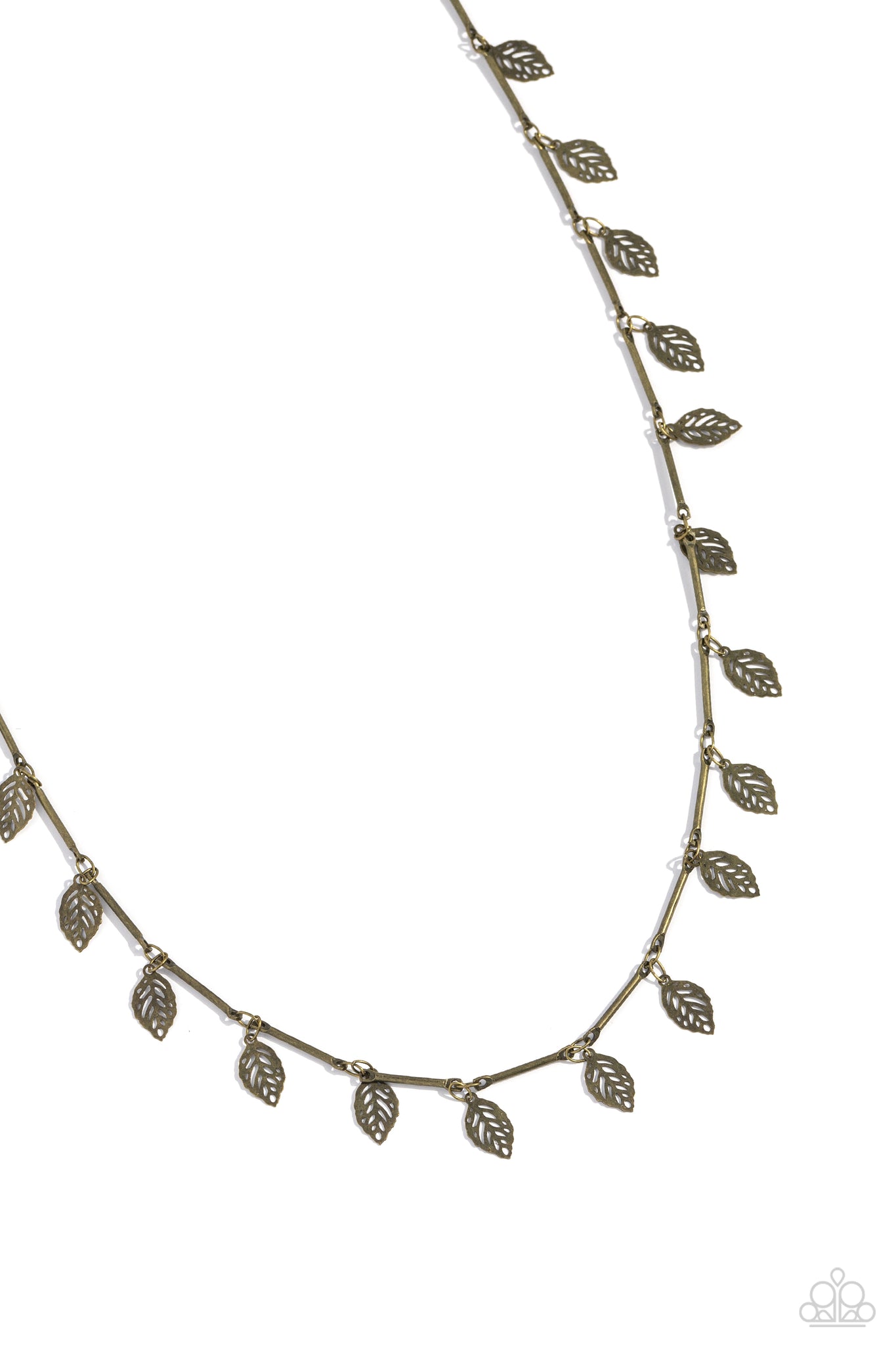 Skinny brass bars link together along the collar to create a dainty display of metallic sheen. A gritty brass leaf separates each bar, bringing shimmery movement to the lightweight design. Features an adjustable clasp closure.