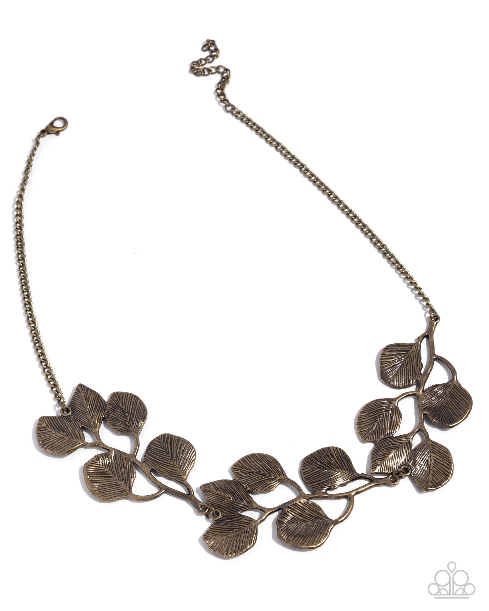 Embossed in life-like detail, branches of brass leaves delicately fan out below the neckline from a classic brass chain for a whimsical statement-making look. Features an adjustable clasp closure.
