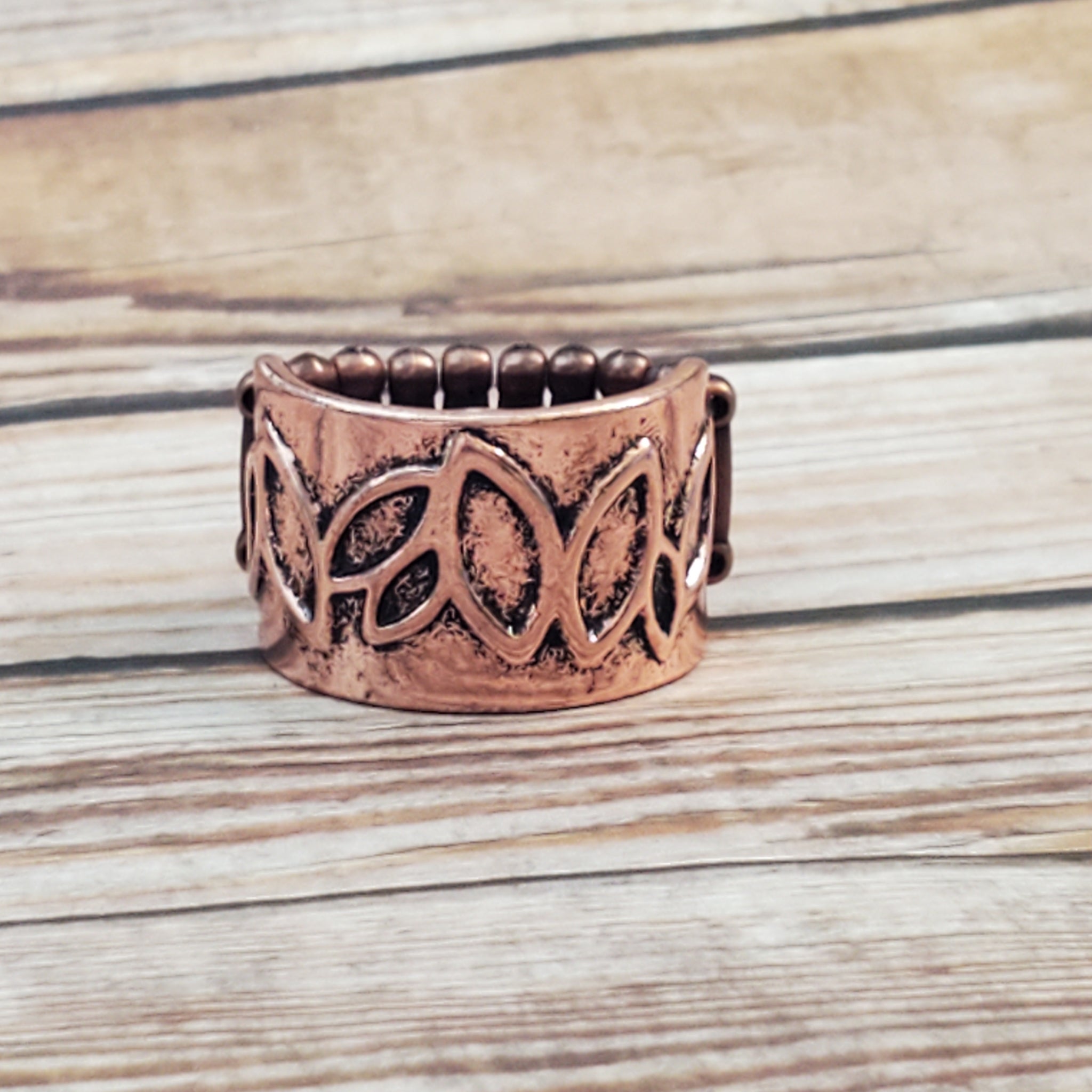 The front of a thick copper band is embossed in whimsical leafy detail, creating a shimmery seasonal centerpiece across the finger. Features a stretchy band for a flexible fit.