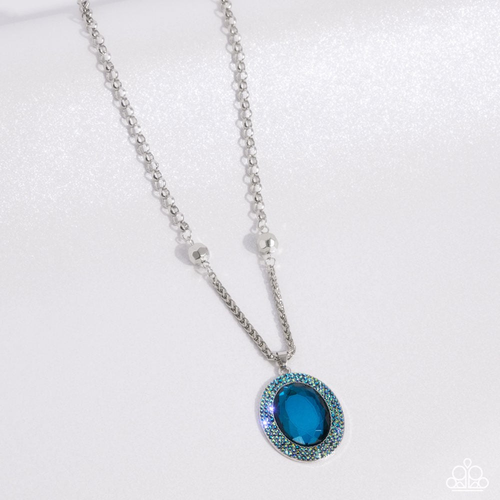 A highly reflective oversized blue oval bead is pressed into a silver pendant bordered with blue iridescent dusted rhinestones for a glittery display below the neckline. A duo of hexagon-textured silver beads separates the mismatched chains that create the necklace chain for additional eye-catching texture. Features an adjustable clasp closure. Due to its prismatic palette, color may vary.