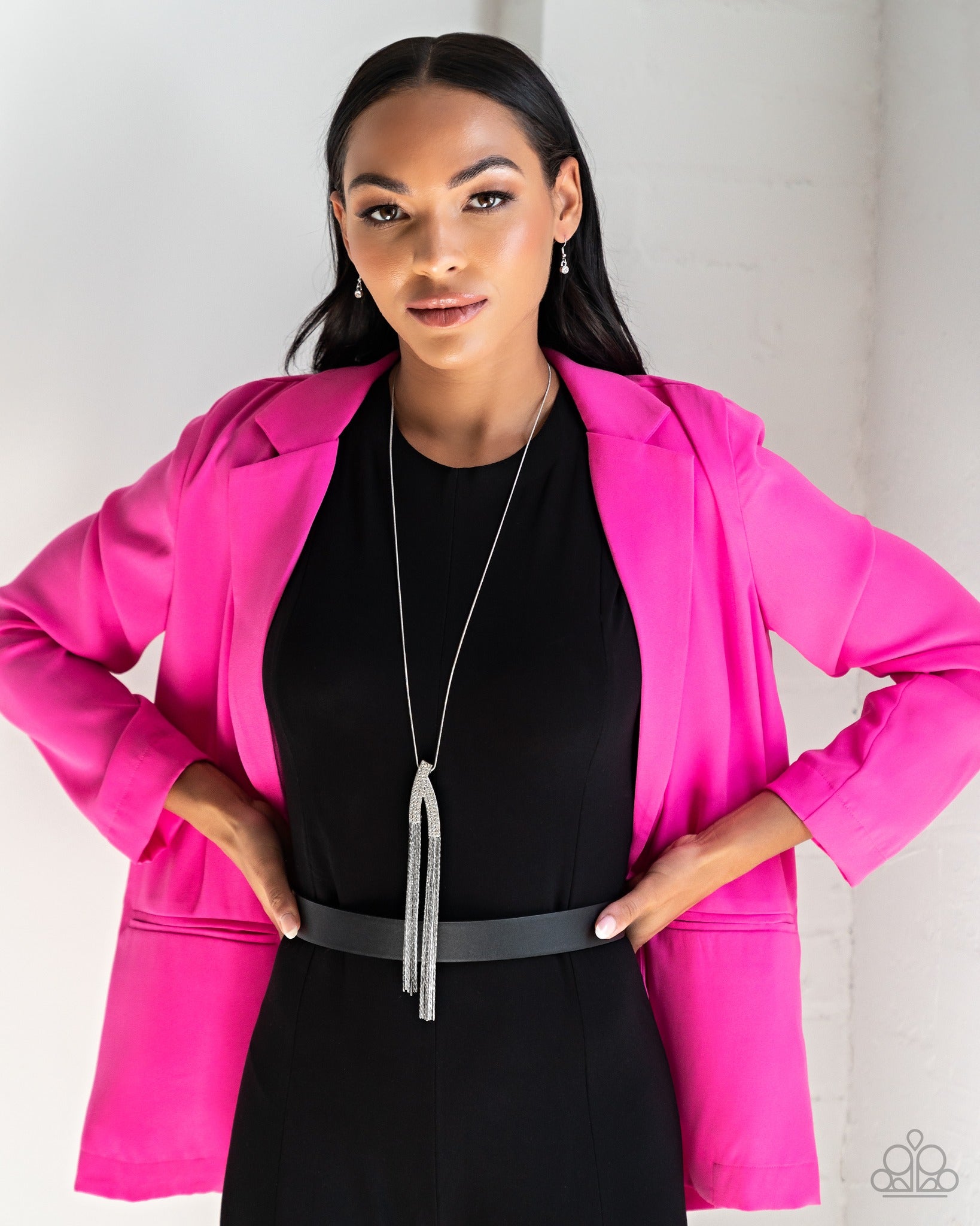 Flat silver chains stream out from the bottom of two overlapping white rhinestone encrusted frames, creating a timelessly twinkling pendant at the bottom of a lengthened silver snake chain. Features an adjustable clasp closure.