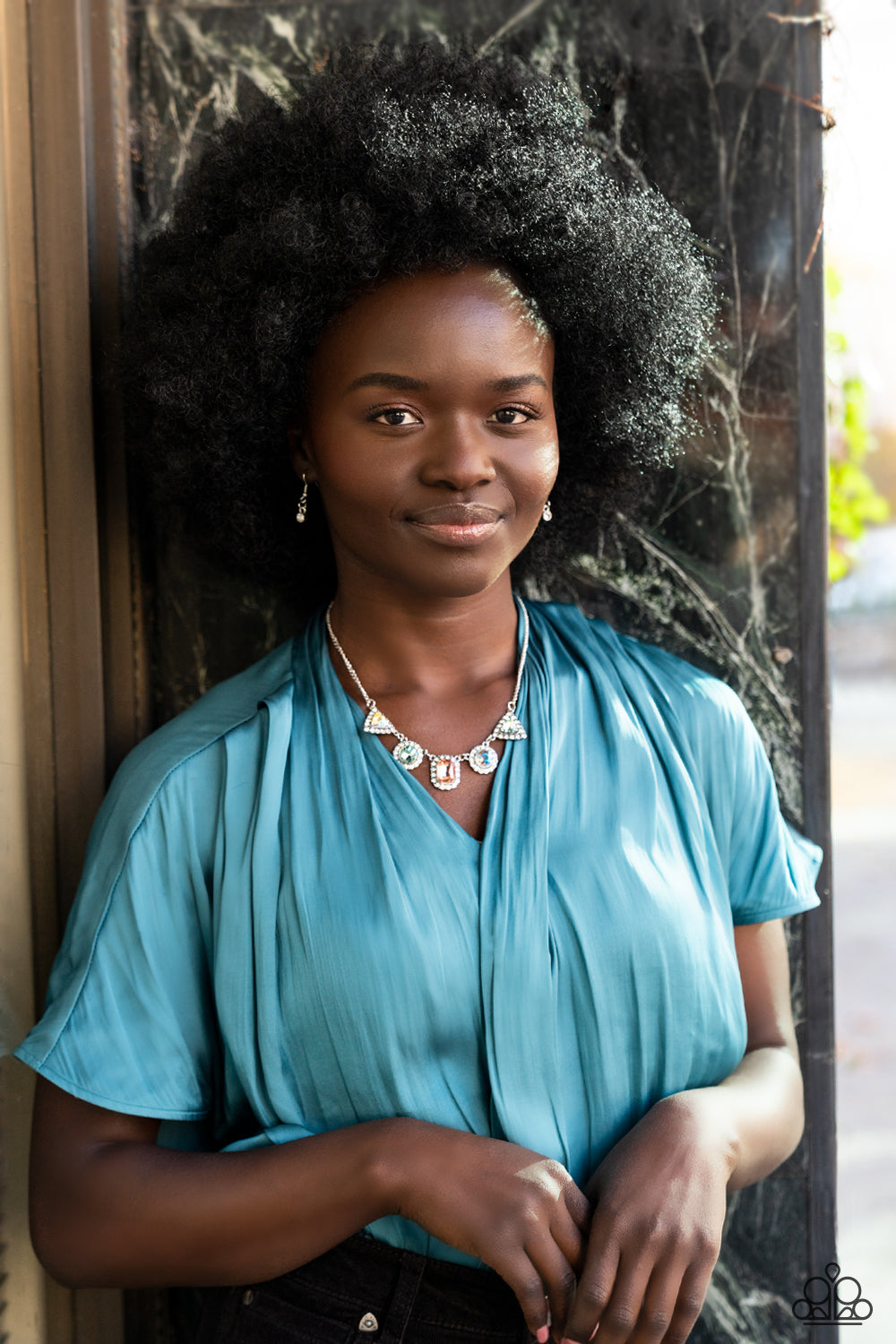 Featuring triangular, round, and emerald style cuts, an iridescent collection of multicolored rhinestones are bordered in glassy white rhinestones as they delicately link below the collar for a sparkly statement. Features an adjustable clasp closure.