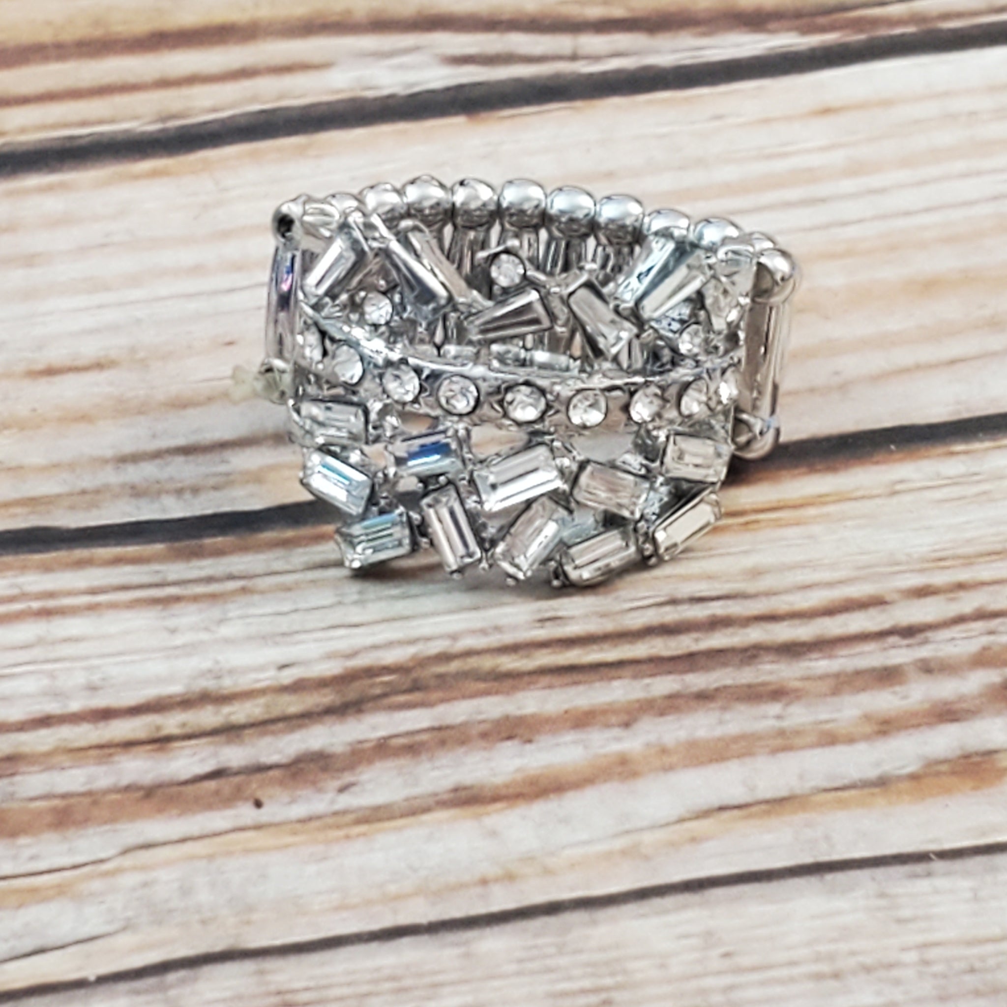 Dotted in dainty white rhinestones, a single silver band separates a haphazard explosion of round and emerald cut rhinestones across the finger. Features a stretchy band for a flexible fit.