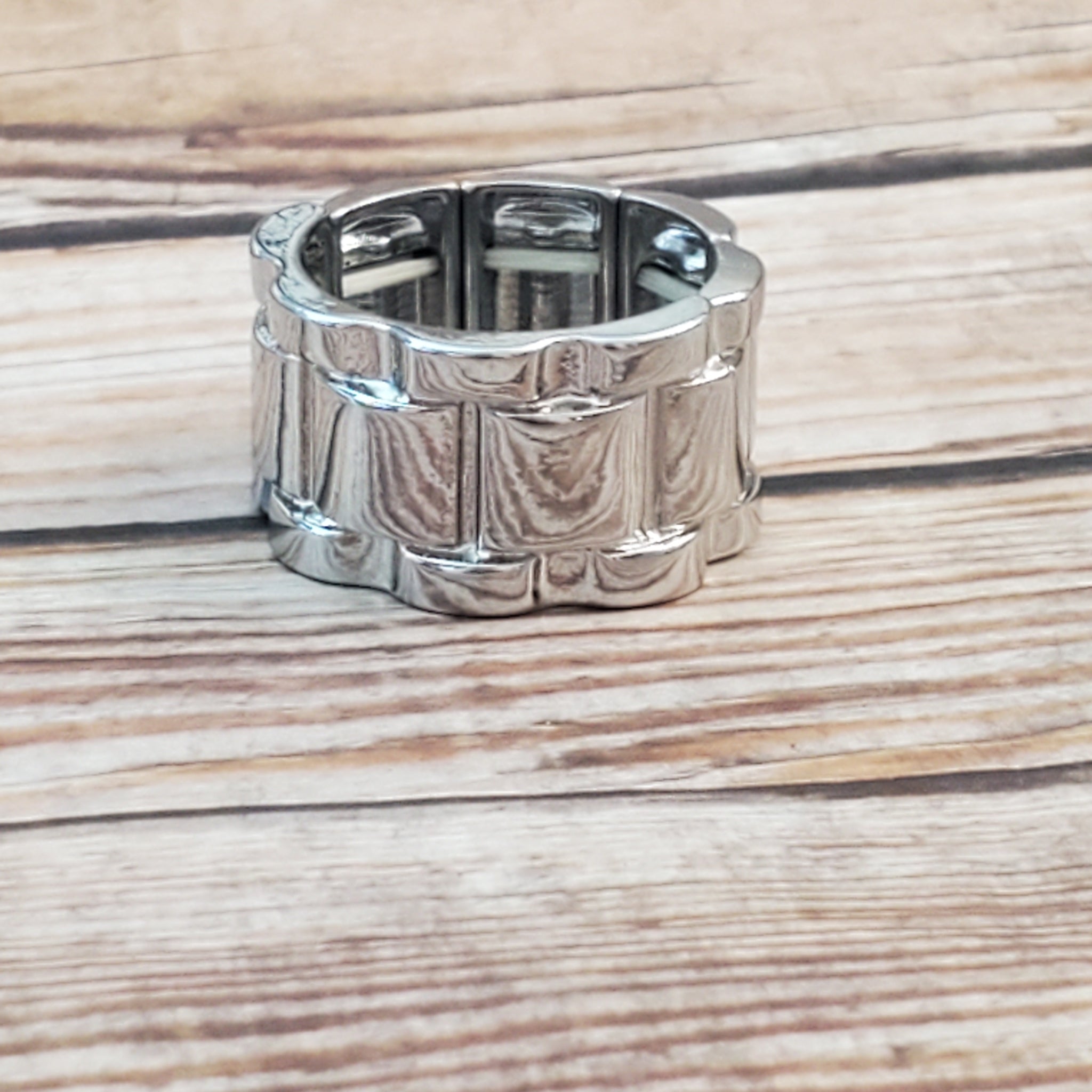 Embossed in a tread-like pattern, an ornate silver band arcs across the finger for a bold look. Features a stretchy band for a flexible fit.