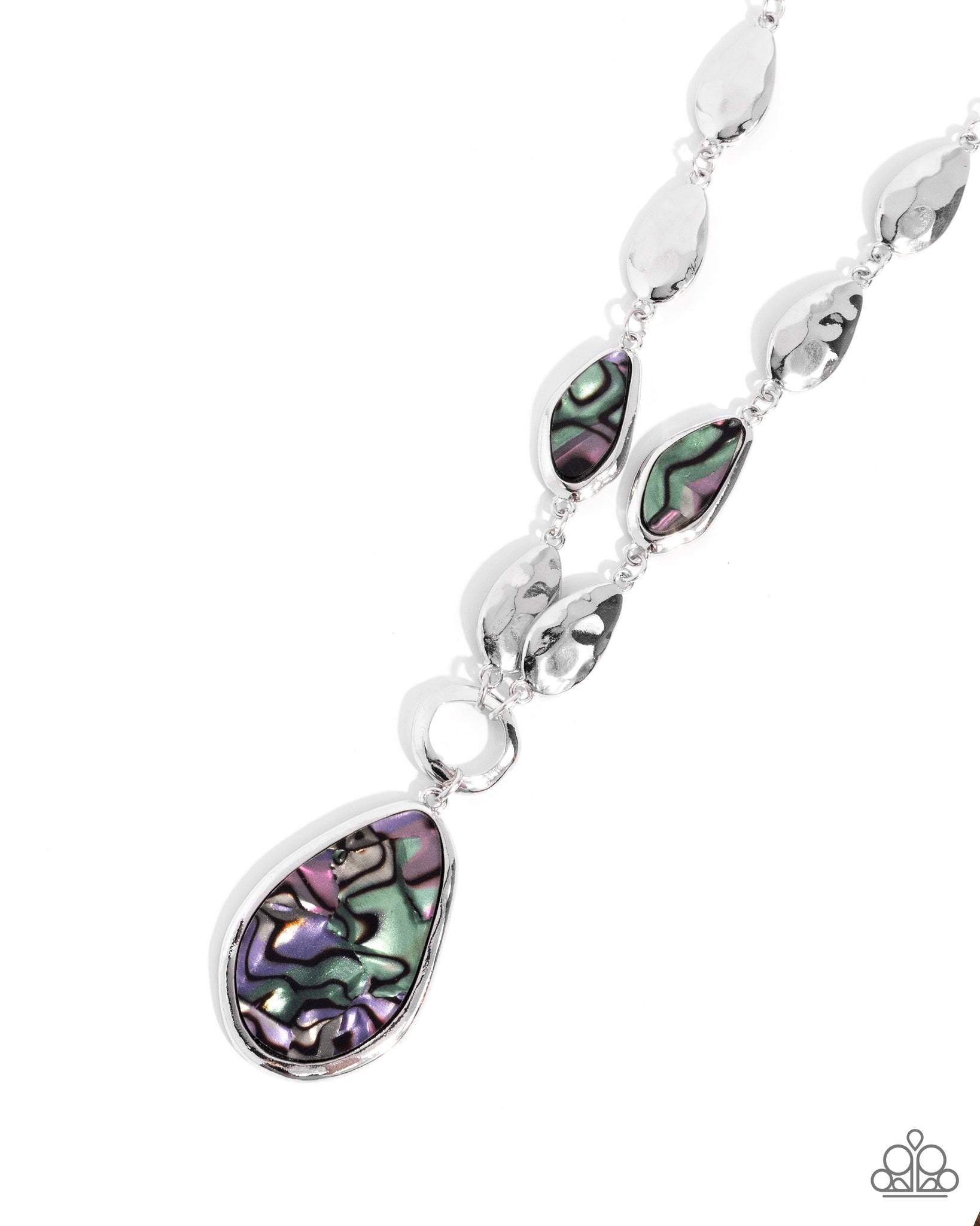 Featuring a subtly hammered finish, a collection of silver teardrops lead down the neckline to faux abalone shells pressed in silver fittings connecting to a subtly hammered silver ring below the neckline. Pressed in an abstract silver teardrop, an oversized faux abalone shell glimmers for an elegantly eclectic display. Features an adjustable clasp closure. Due to its prismatic palette, color may vary.