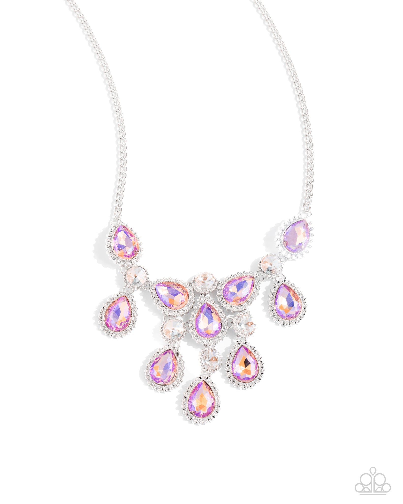 An explosion of round, teardrop, and marquise-cut gems in varying sizes bordered by tactile silver studs cluster together to create a glittery orange showcase down the neckline. Featuring various shades of orange and white, each gem reflects light off of its faceted surface emitting further glitz and glam. Features an adjustable clasp closure.
