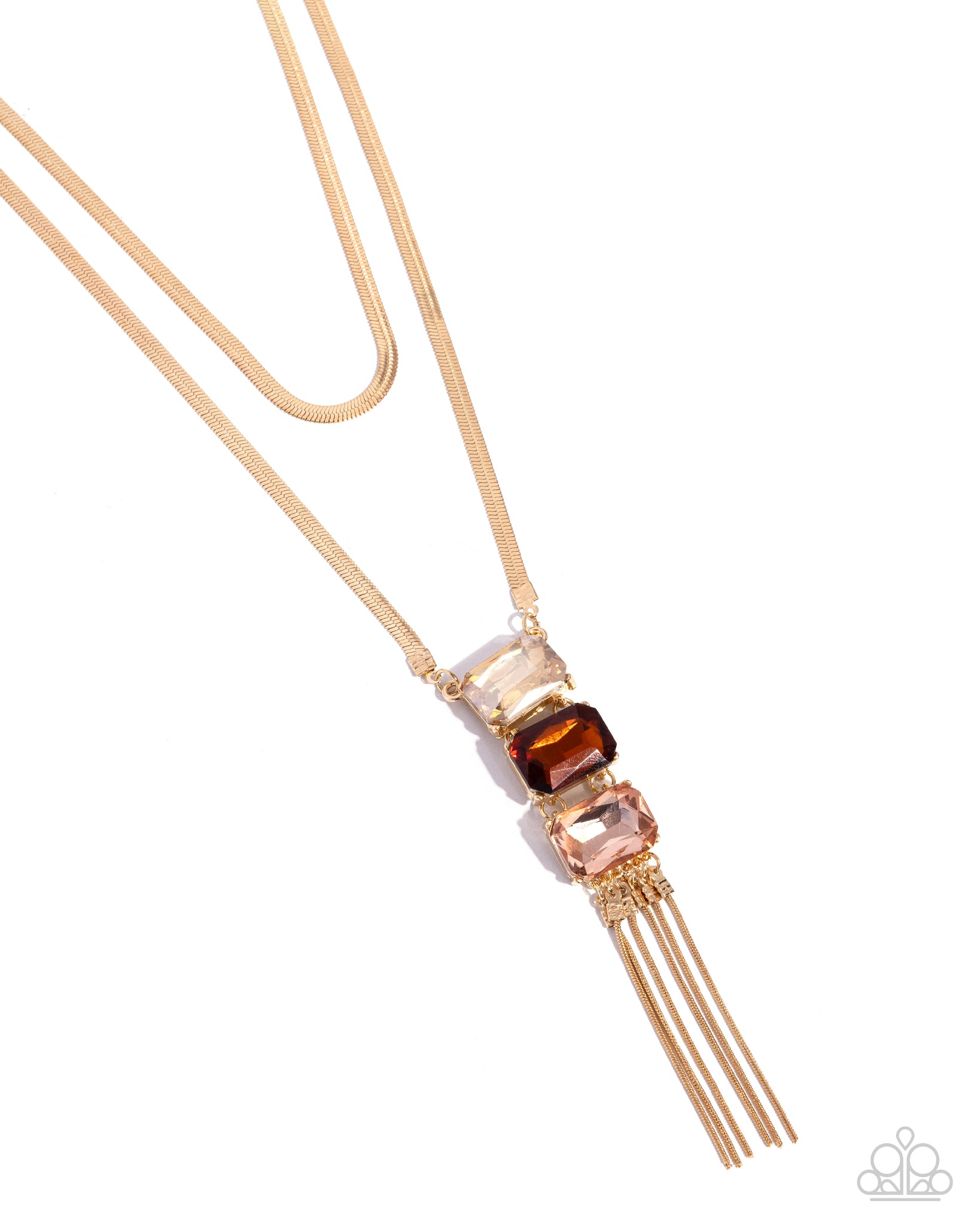Gold herringbone chains layer below the neckline, with the lowermost chain connecting to three emerald-cut faceted champagne, topaz, and peach gems for a pop of dramatic color. Strands of dainty gold herringbone chains give way from the trio of multicolored gems for additional sway and attention. Features an adjustable clasp closure.