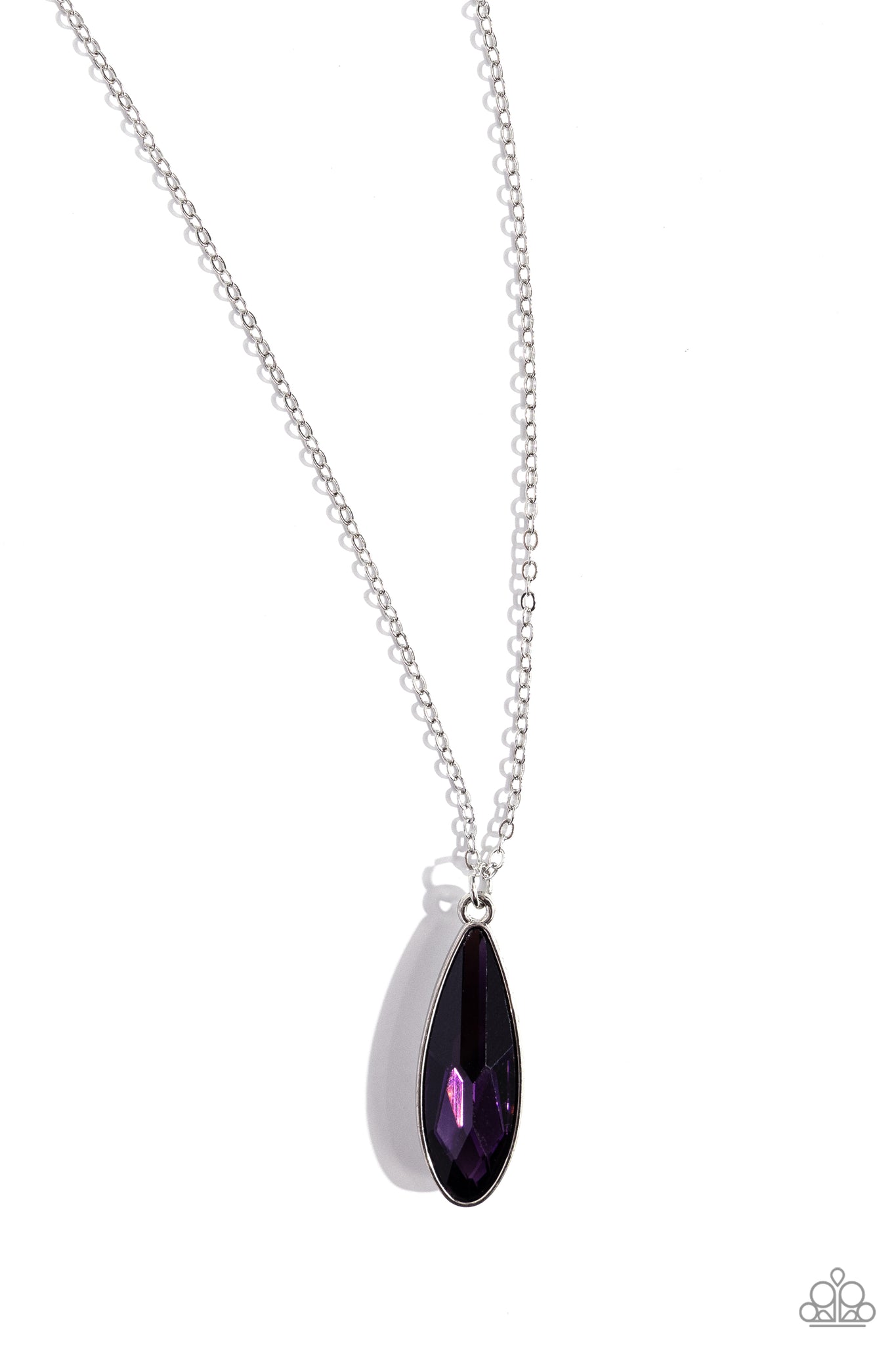 Encased in a sleek silver fitting, an elongated purple teardrop gem swings from the bottom of a classic silver chain below the collar for a timeless elegance. Features an adjustable clasp closure.