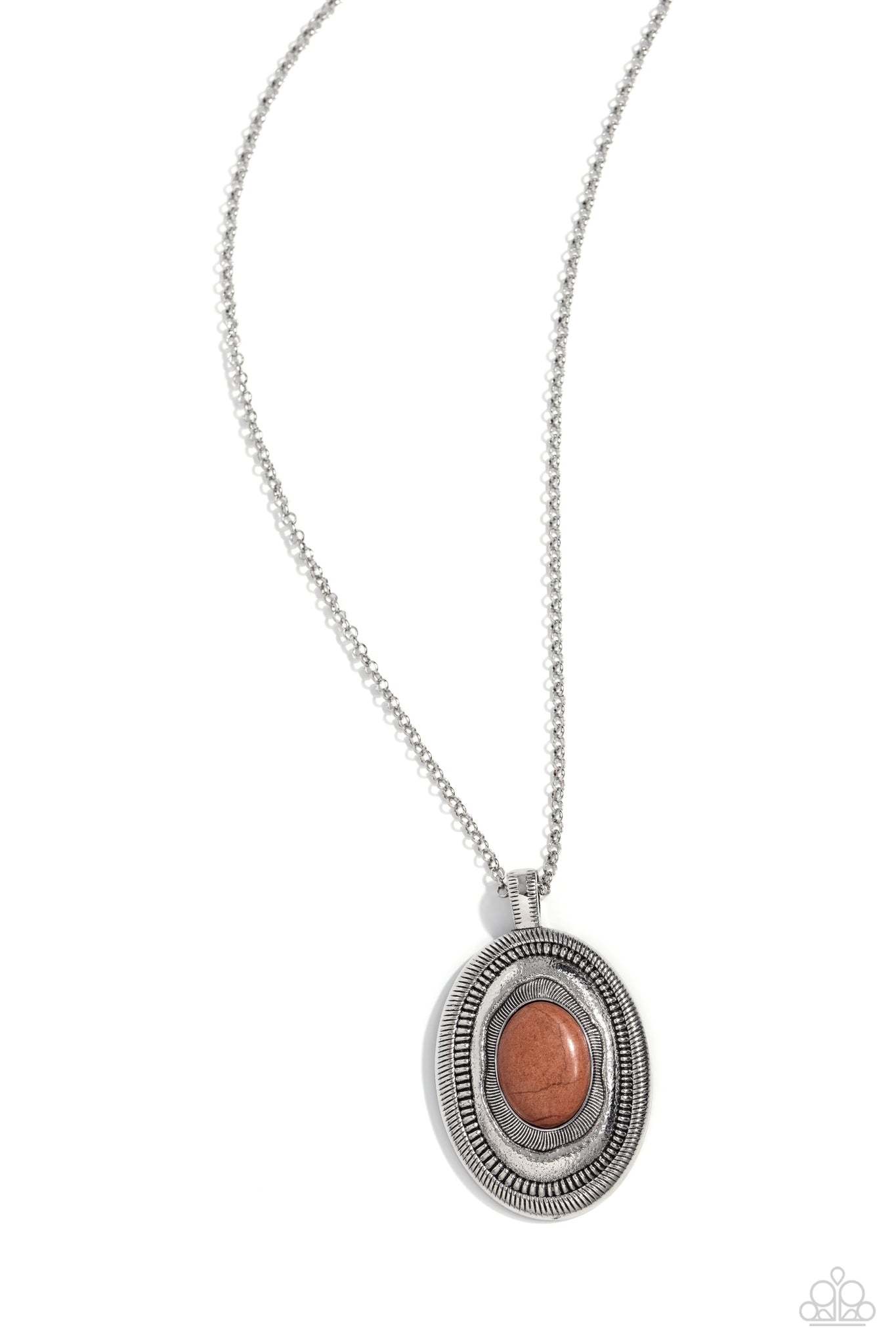 An oval brown stone is pressed into the center of an asymmetrical silver frame radiating with mismatched silver textures, resulting in an artisan inspired pendant at the bottom of an extended silver chain. Features an adjustable clasp closure.