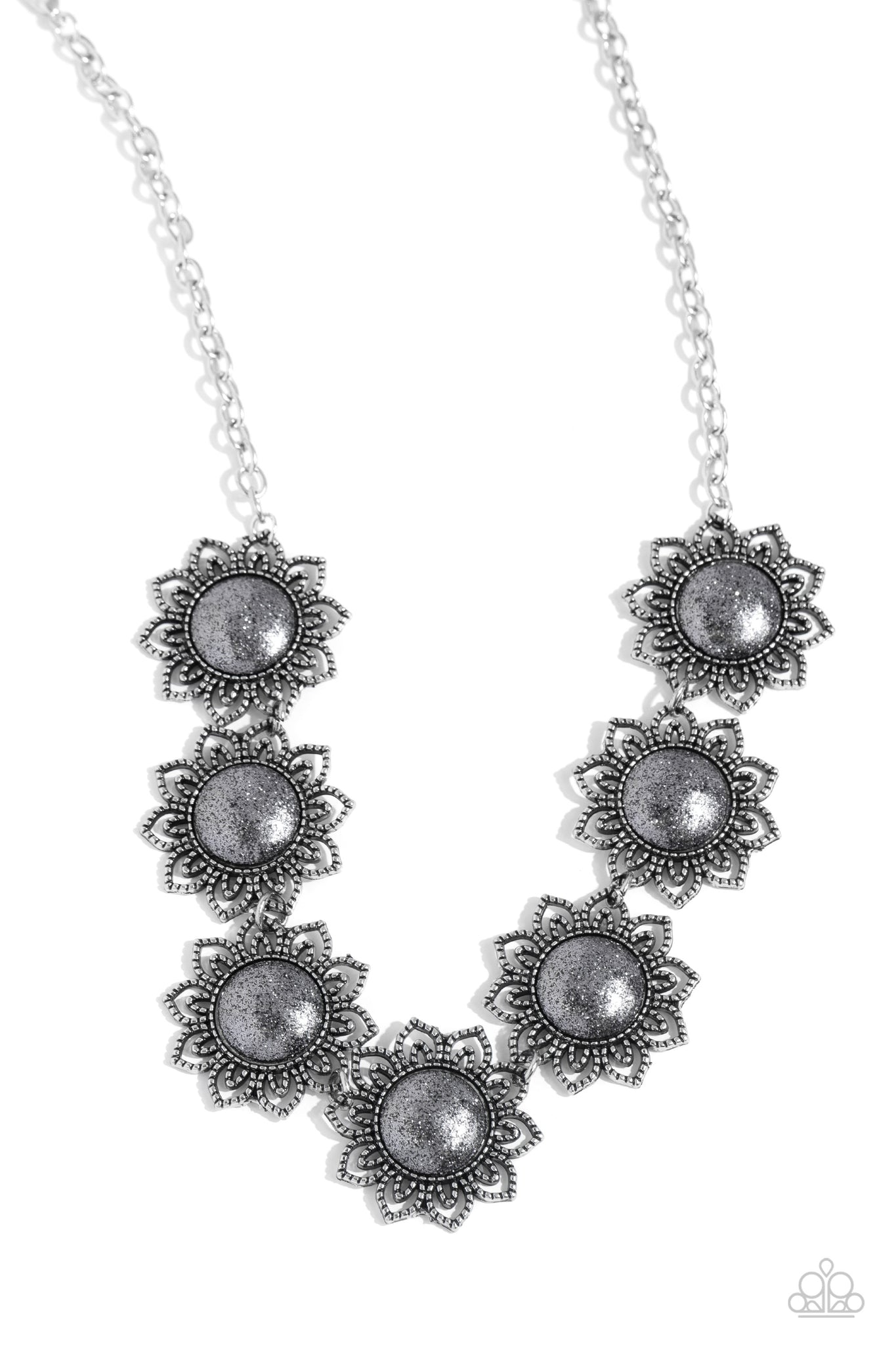 Studded in tactile detail, a collection of silver mandala-like floral frames with silver glittery centers connect below the collar from a classic silver chain for a gorgeous pop of color. Features an adjustable clasp closure.