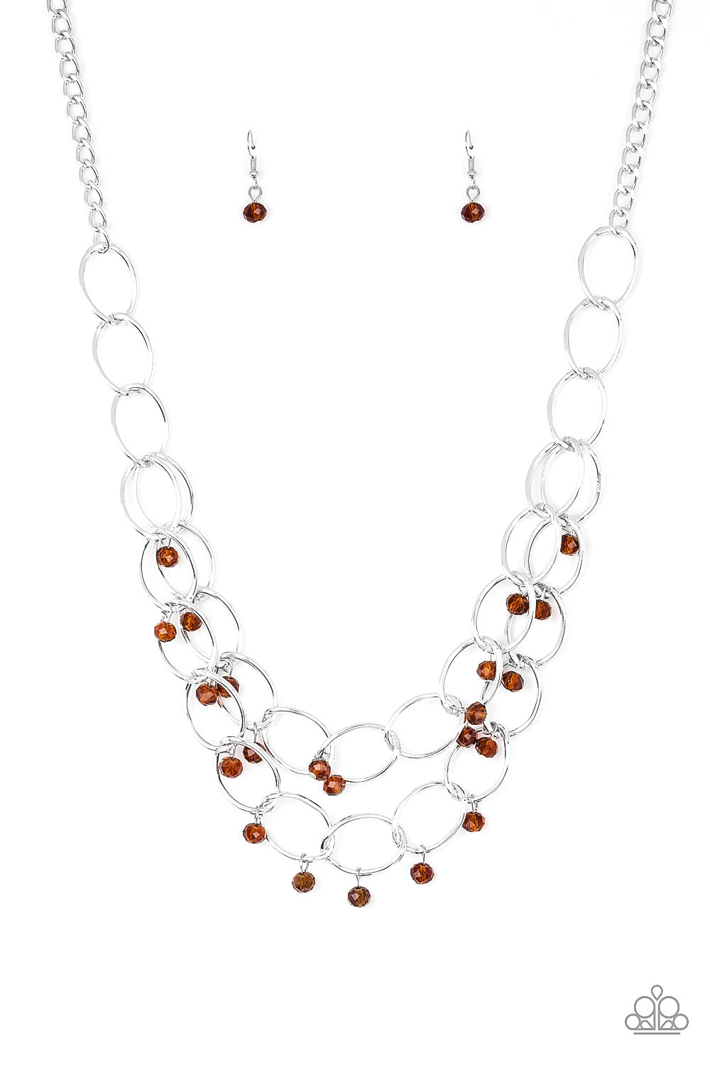 Shimmery brown crystal-like beads swing from two layers of oversized silver links below the collar for a refined look. Features an adjustable clasp closure.