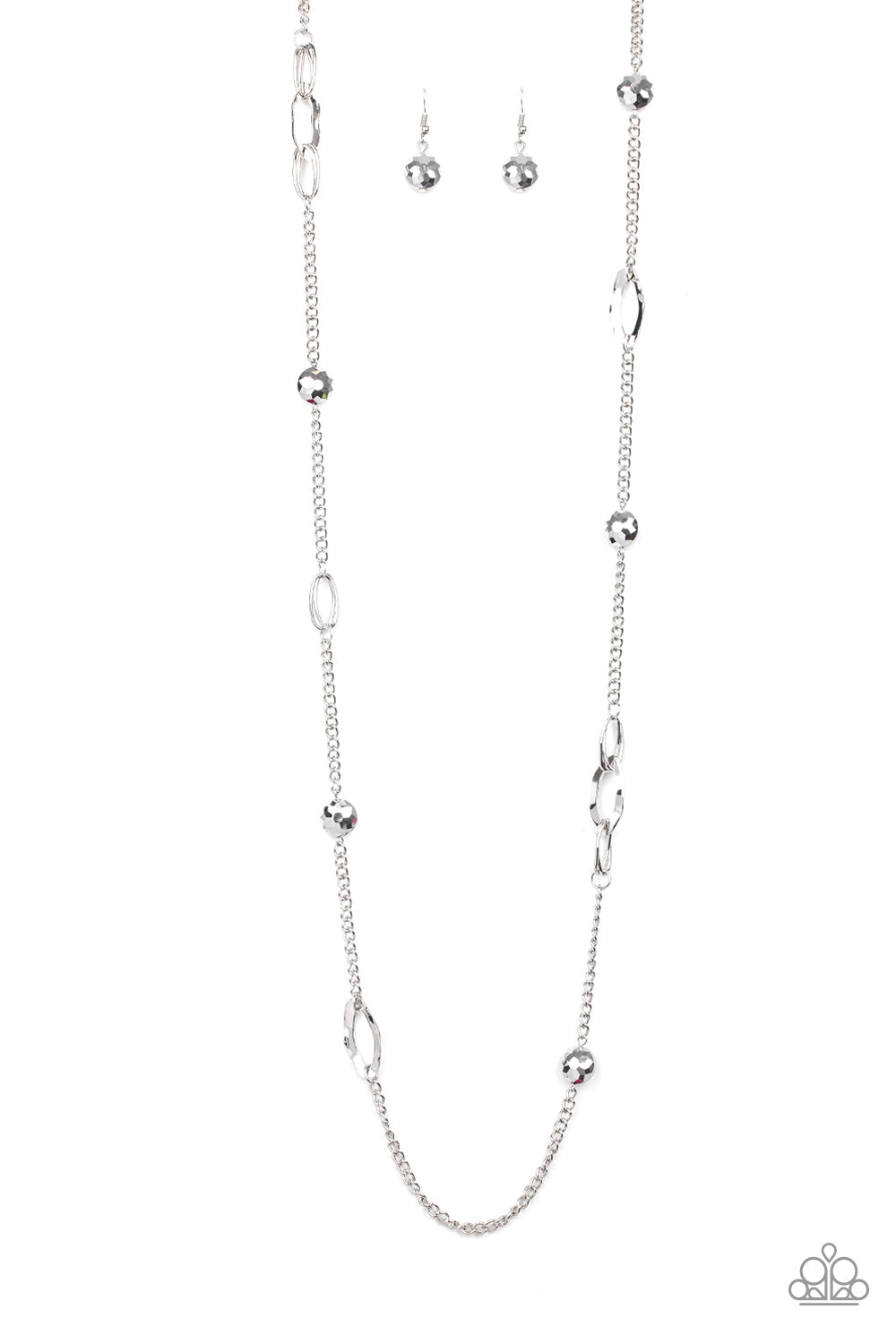 A collection of hematite rhinestone gems and abstract silver rings trickle along a classic silver chain across the chest for a refined flair. Features an adjustable clasp closure.