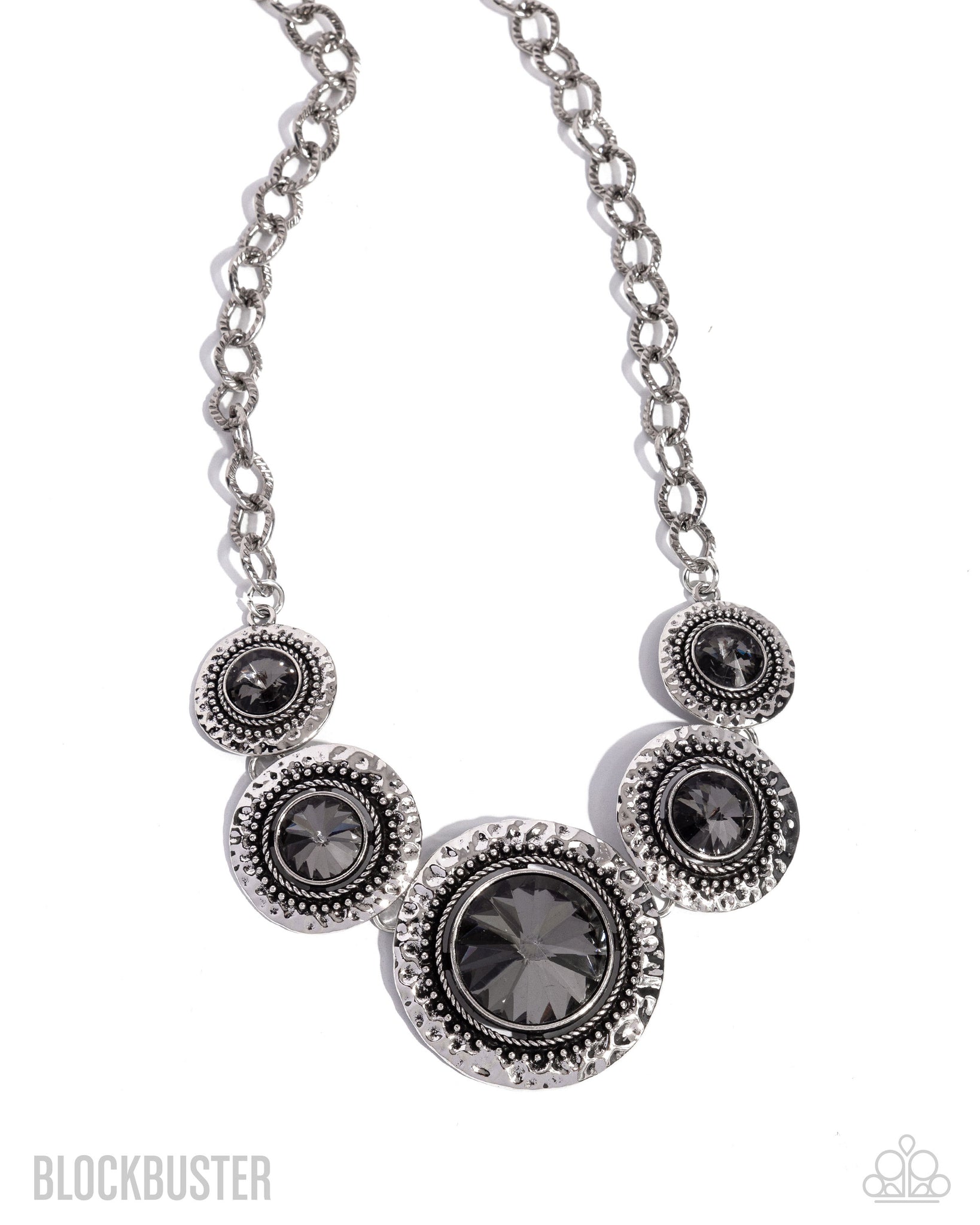 Gradually increasing in size, dramatically oversized smoky gems are pressed into the centers of hammered and silver studded frames. The blinding frames link below the collar for a glamorous, statement-making finish. Features an adjustable clasp closure.