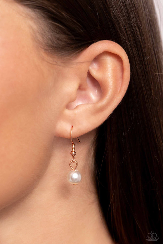 A glossy white pearl, shiny copper starfish charm, and chiseled piece of blue sea glass glide along an elongated shiny copper chain for an ocean-inspired display. Features an adjustable clasp closure.