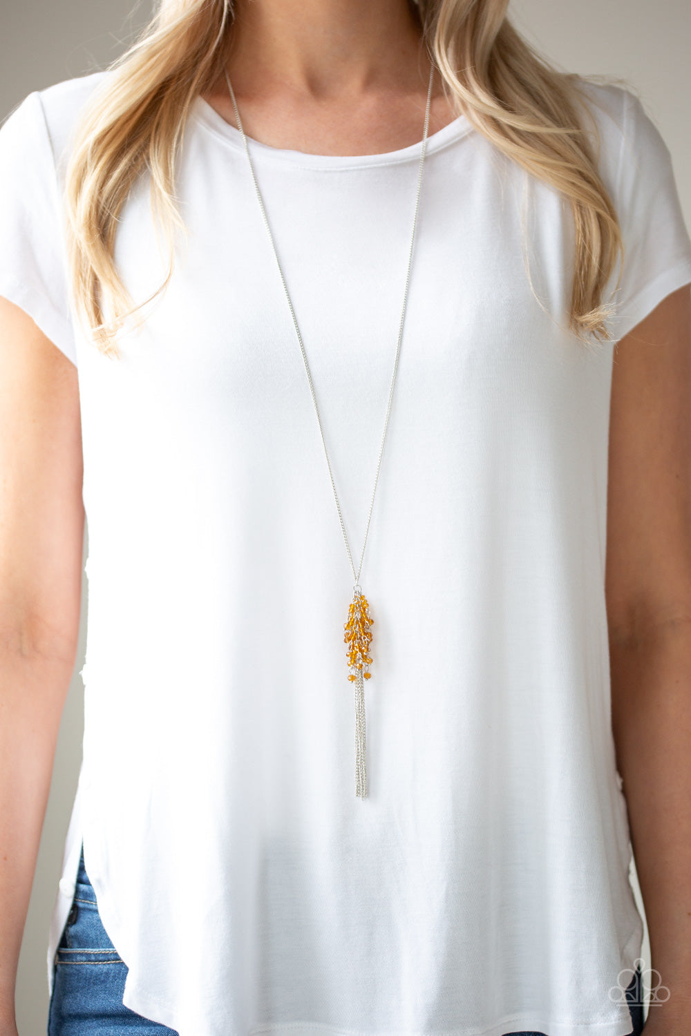 Twinkling brown crystal-like beads are threaded along dainty silver rods, creating a sparkling fringe at the bottom of a lengthened silver chain. A shimmery silver tassel extends from the bottom for a whimsical finish. Features an adjustable clasp closure.