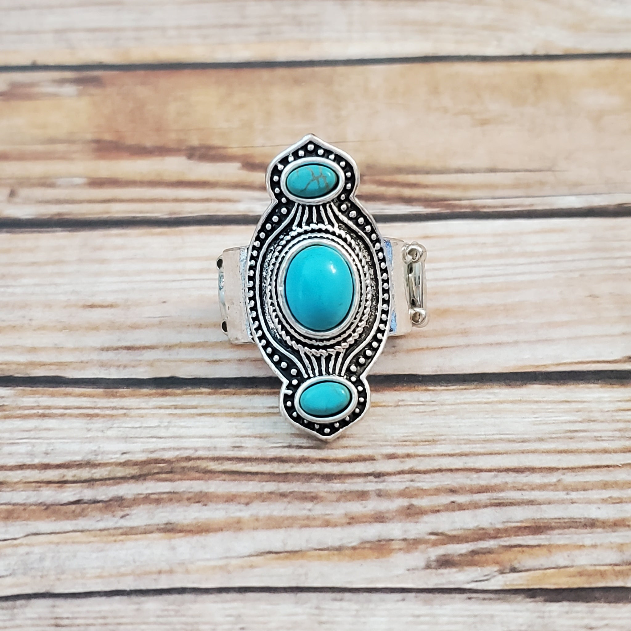 Three refreshing turquoise stones are pressed into an abstract silver frame radiating with texture and studded details for a seasonal look. Features a stretchy band for a flexible fit.