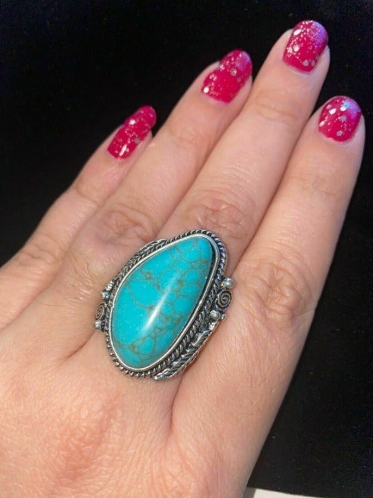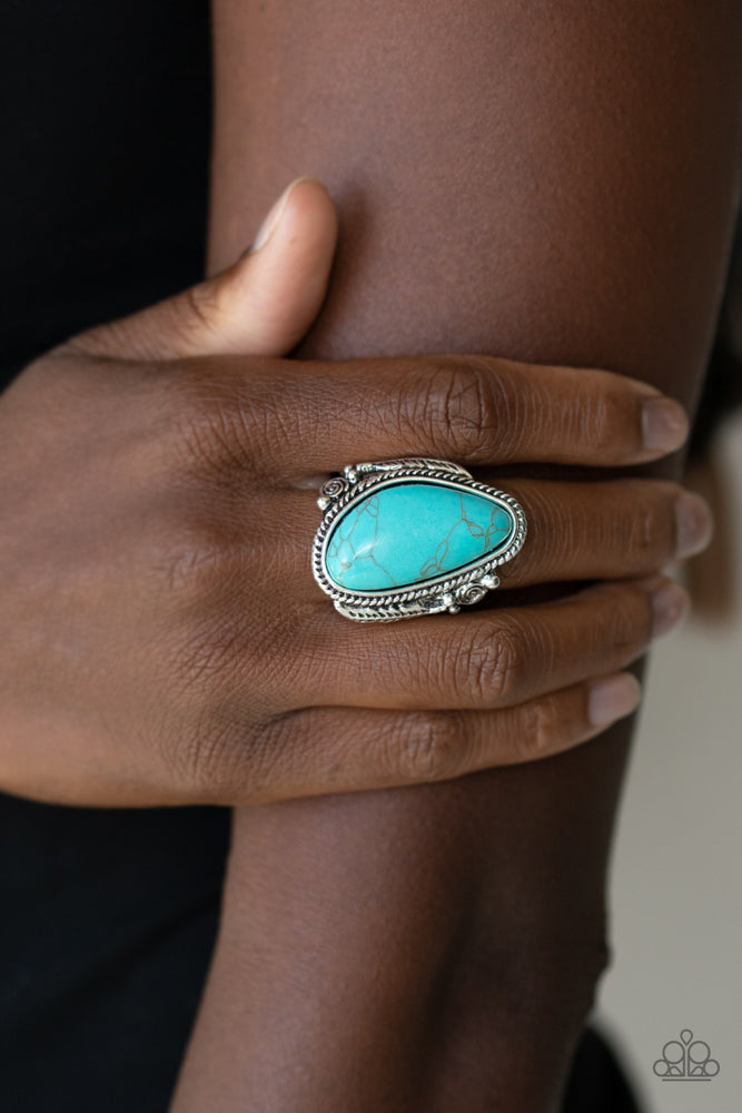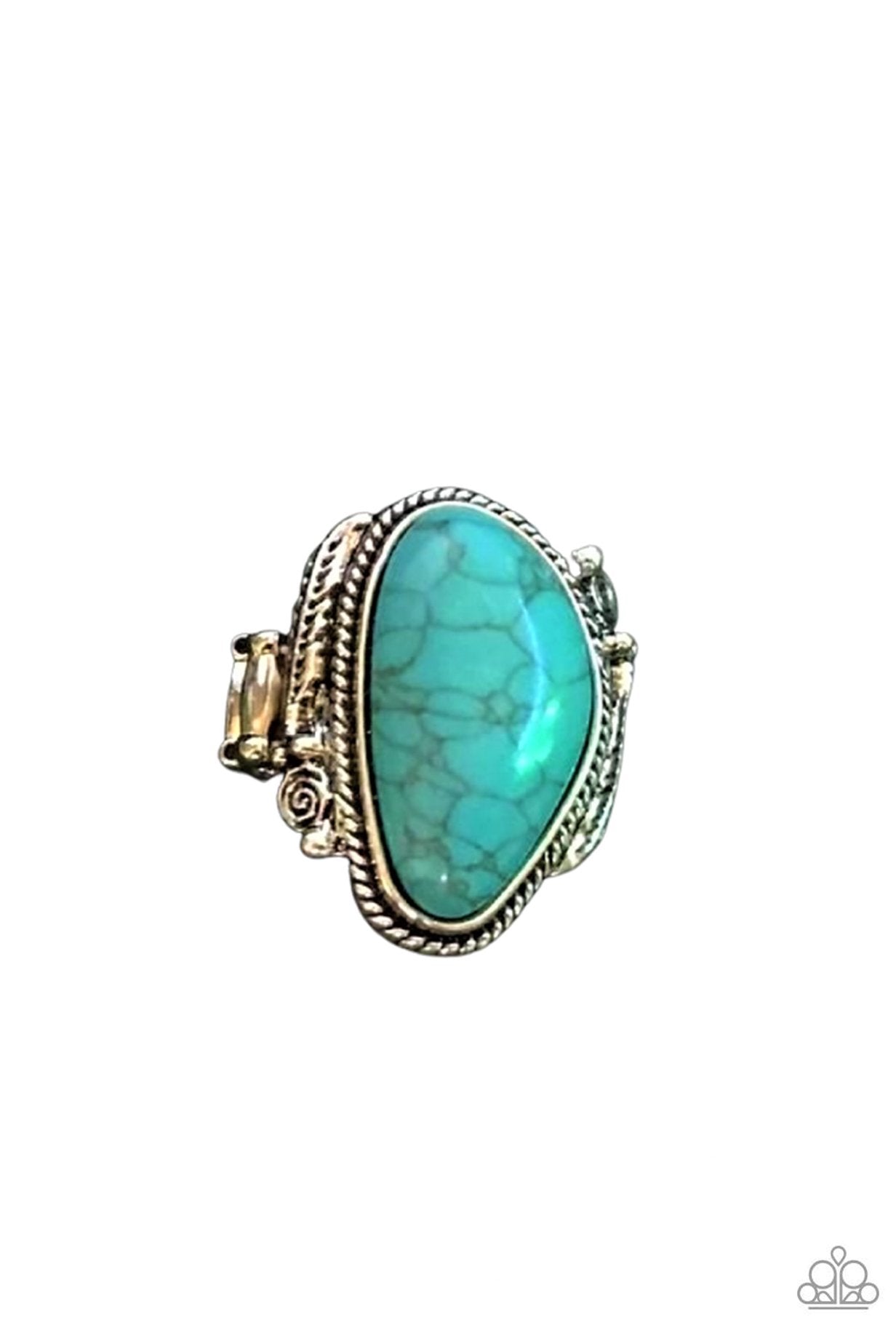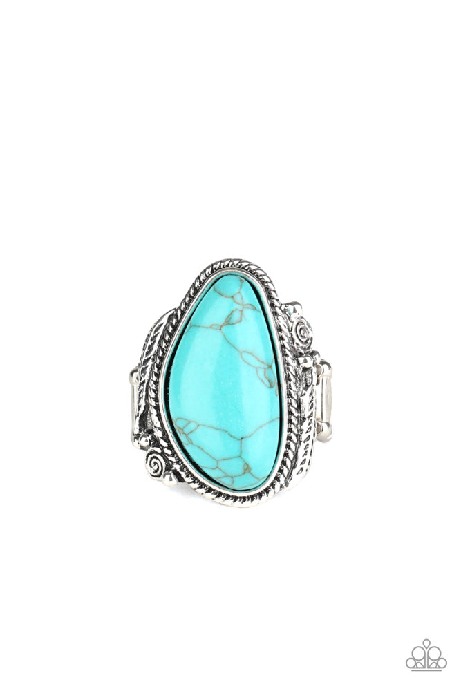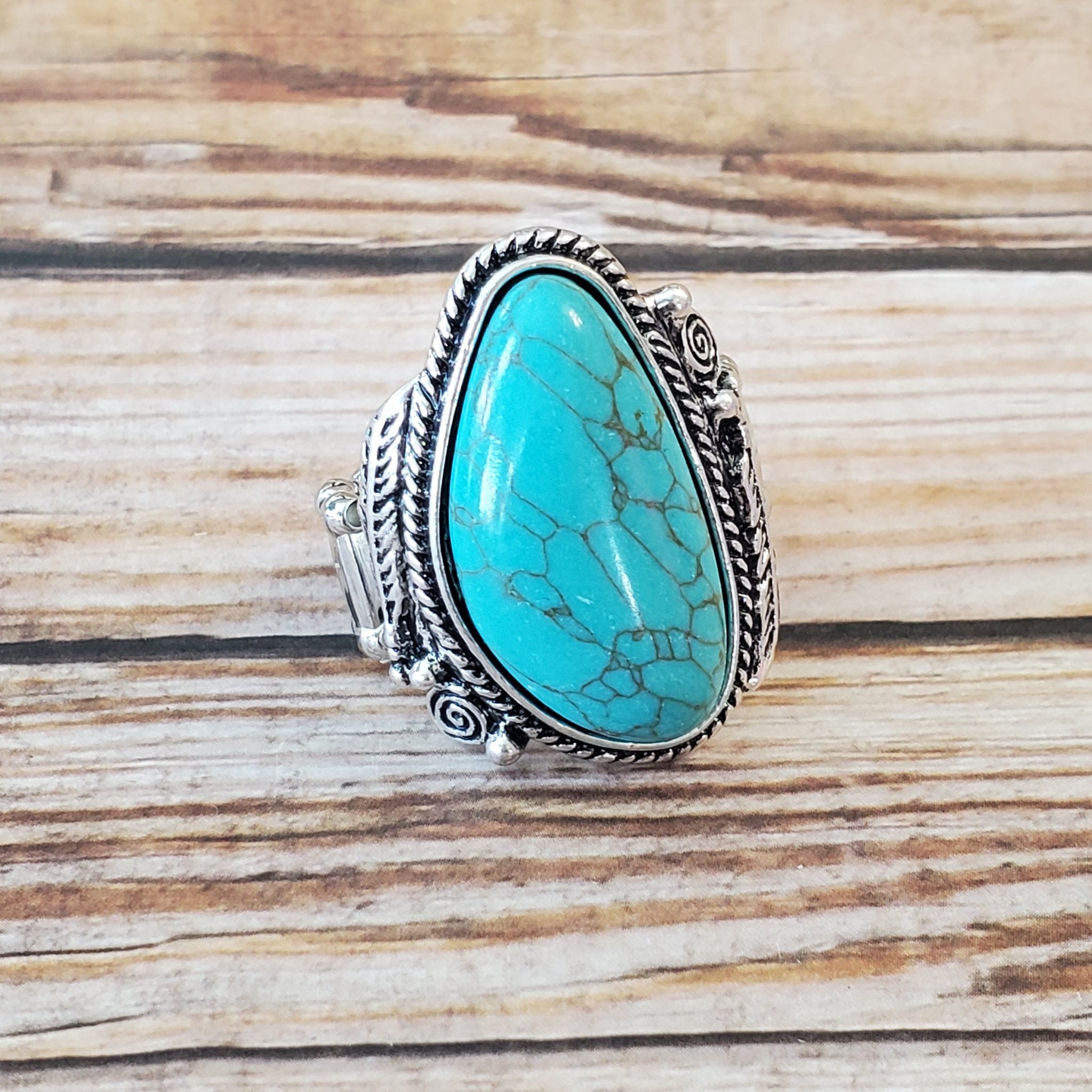 An asymmetrical turquoise stone is nestled inside of an ornate silver frame flanked by silver swirling frames and dainty silver feather charms for a whimsical look. Features a stretchy band for a flexible fit.