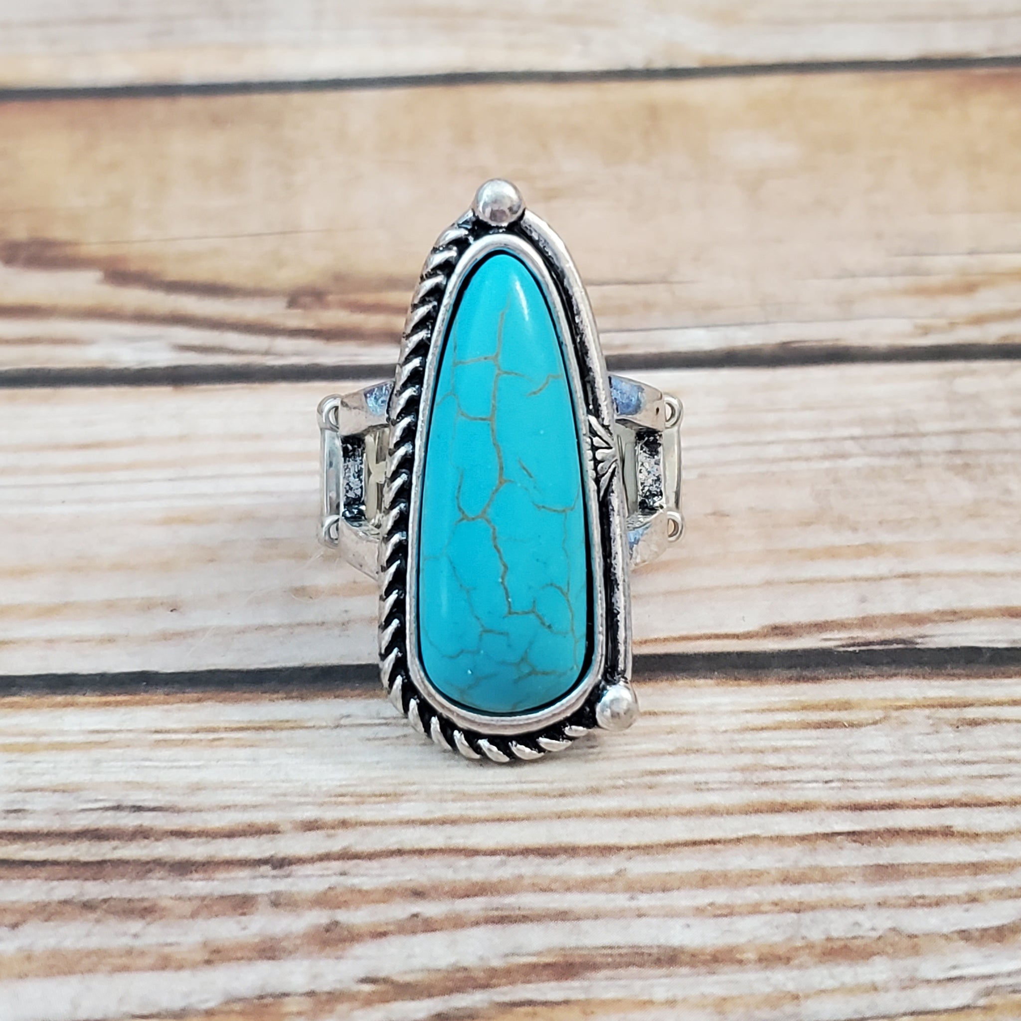 Chiseled into an oblong teardrop shape, a refreshing turquoise stone is pressed into an asymmetrically patterned silver frame for an artisan inspired look. Features a stretchy band for a flexible fit.
