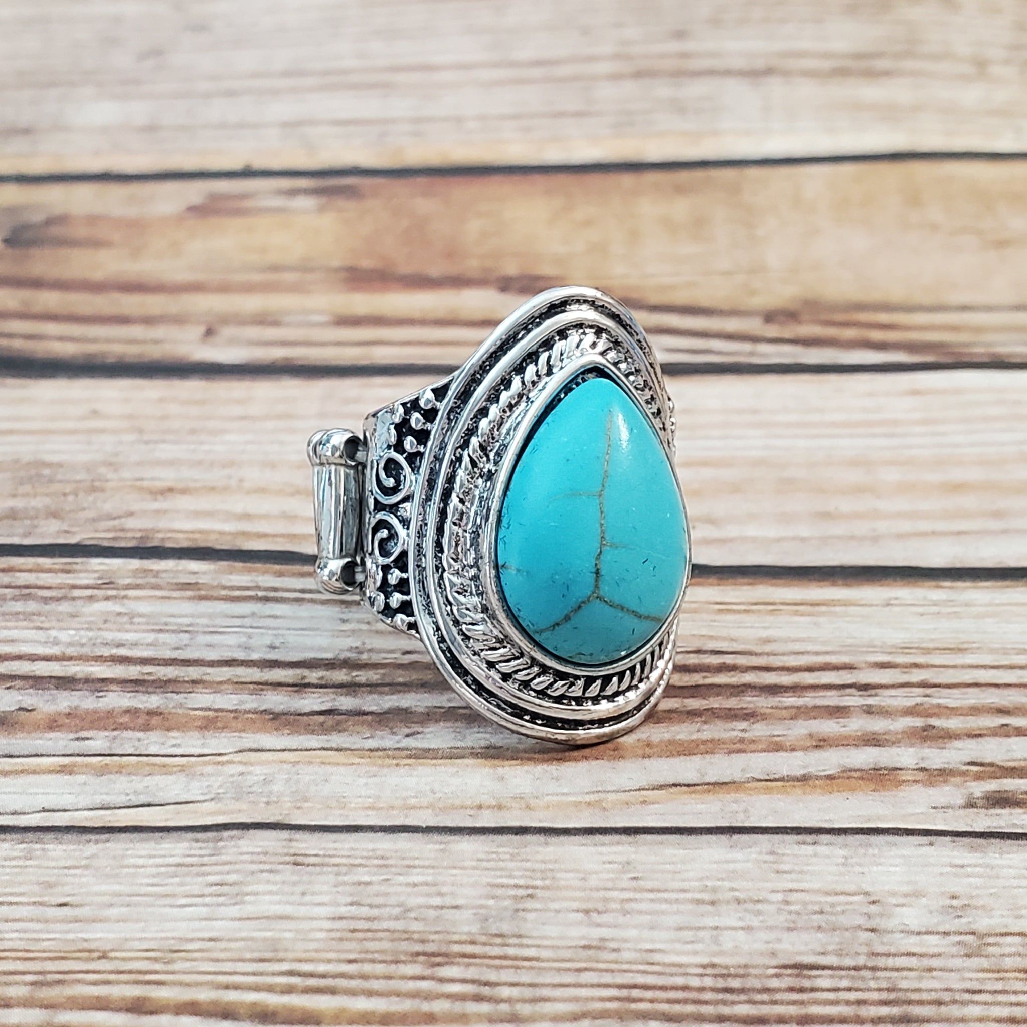A teardrop turquoise stone is pressed into the center of an ornate silver frame for a seasonal look. Features a stretchy band for a flexible fit.