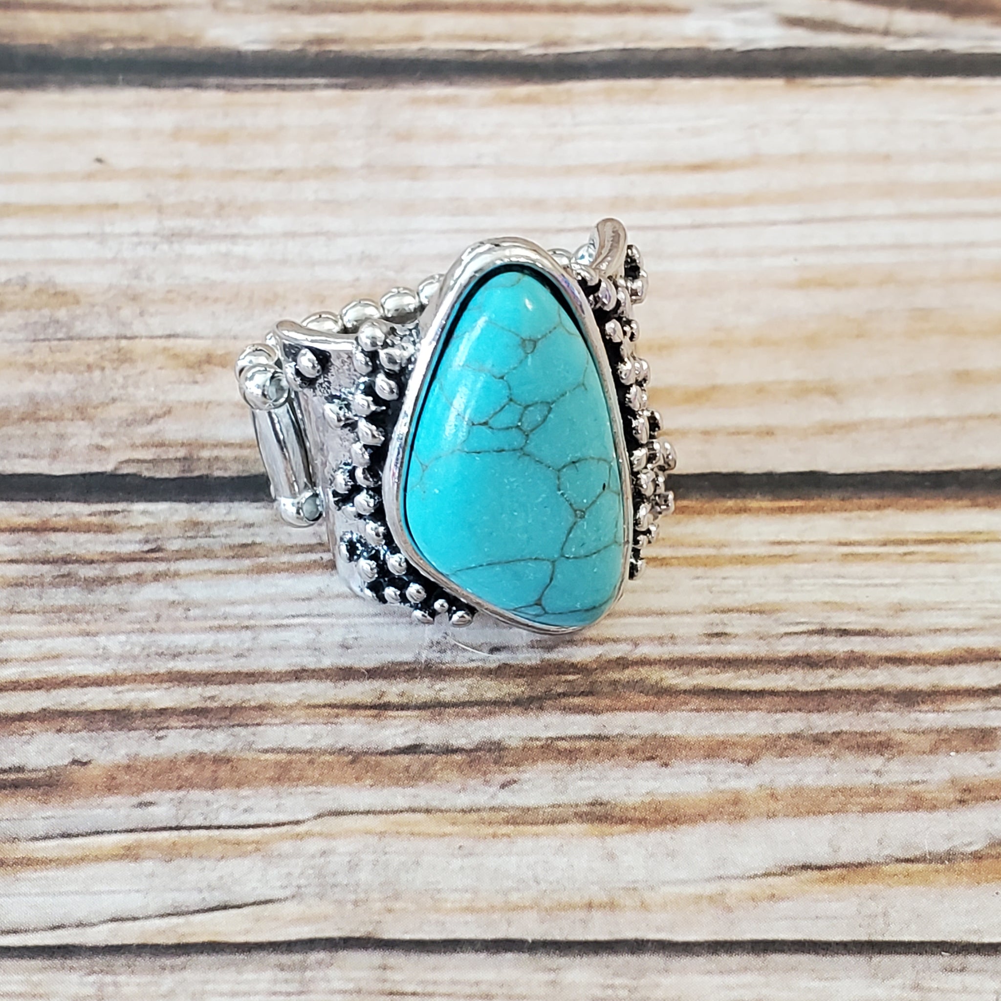An asymmetrical turquoise stone is pressed into the center of an antiqued silver band radiating with silver studs, creating a rustic centerpiece atop the finger. Features a stretchy band for a flexible fit.