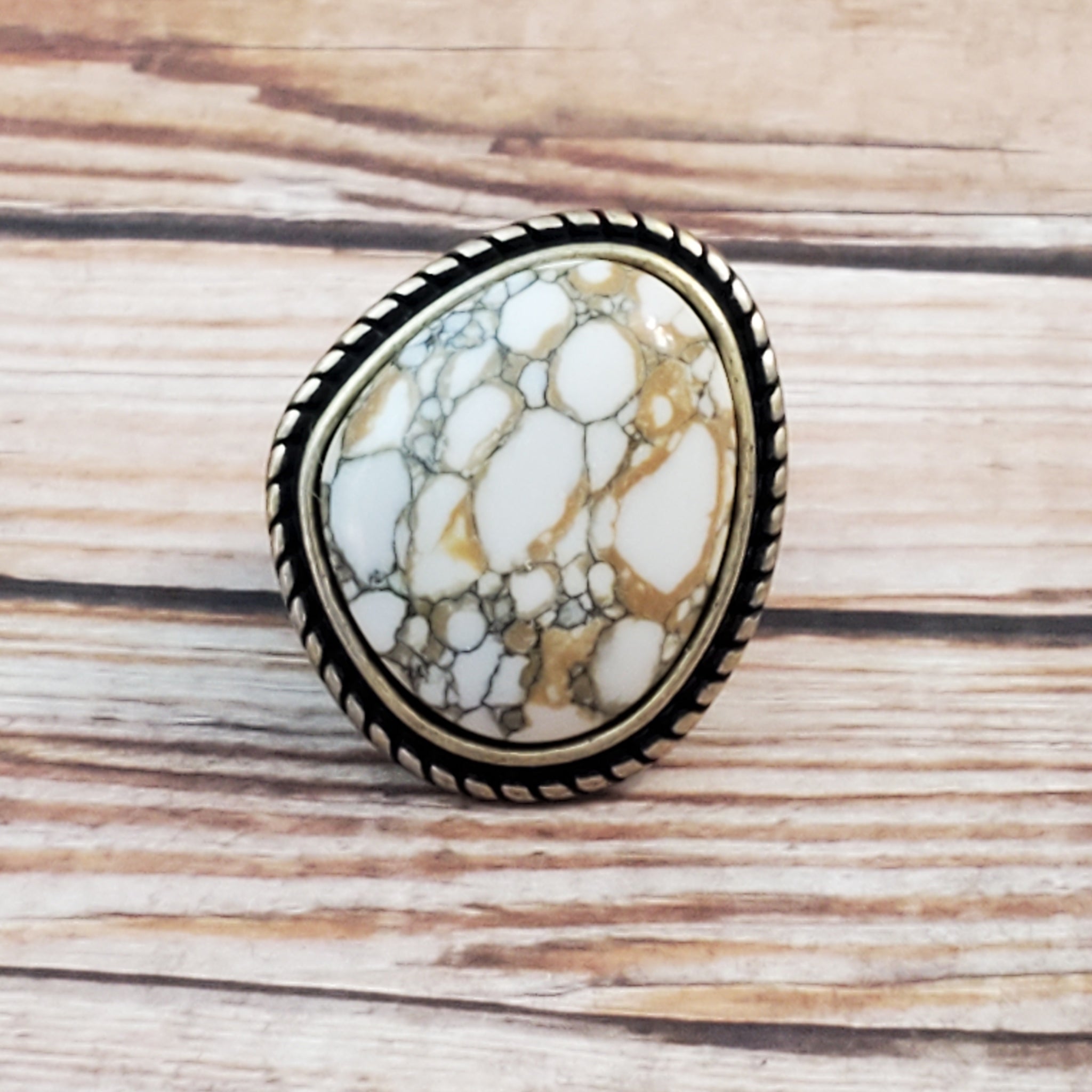 An earthy brown and white marbled stone is pressed into a rustic brass frame adorned with rope-like texture, creating a rustic centerpiece atop the finger. Features a stretchy band for a flexible fit.