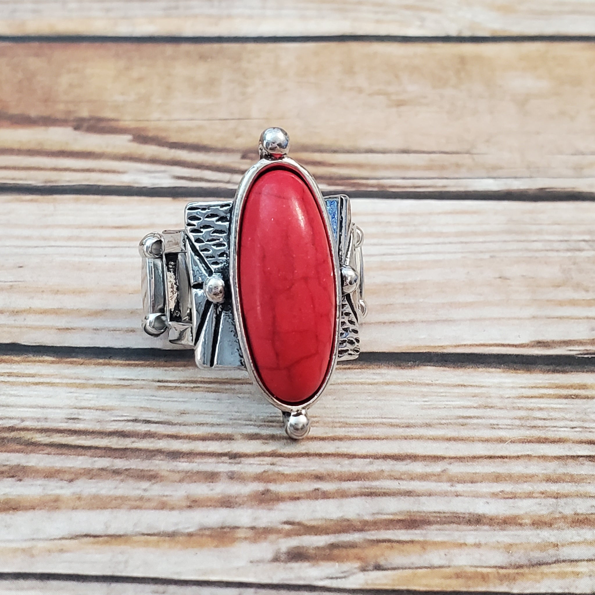 An oval red stone is nestled inside a studded silver fitting that sits atop a decorative silver frame stamped in tribal inspired textures, creating a rustic centerpiece. Features a stretchy band for a flexible fit.