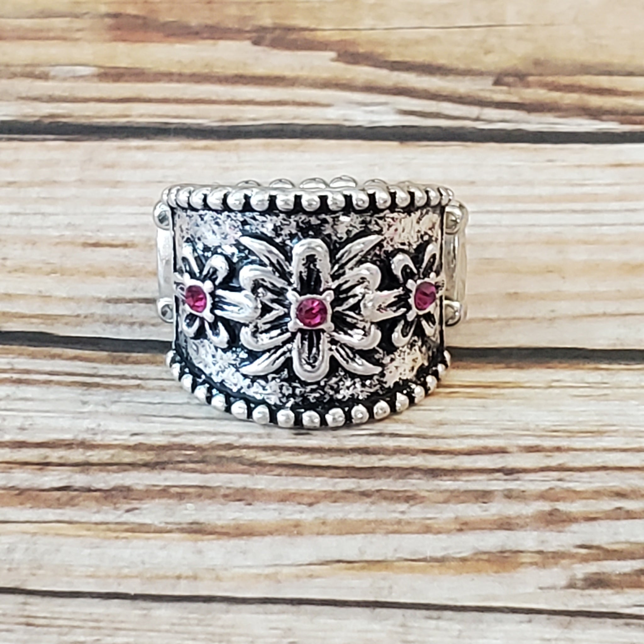 Dotted with dainty Pink Peacock rhinestone centers, tropical inspired flowers are embossed across the front of an antiqued studded silver band for a whimsical display. Features a stretchy band for a flexible fit.